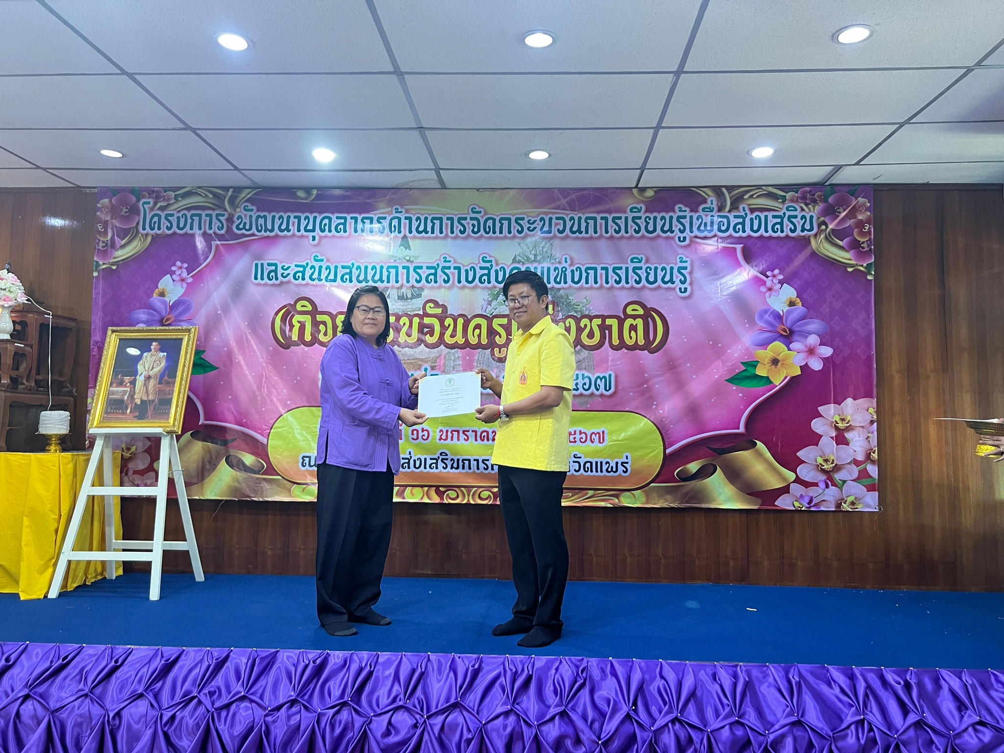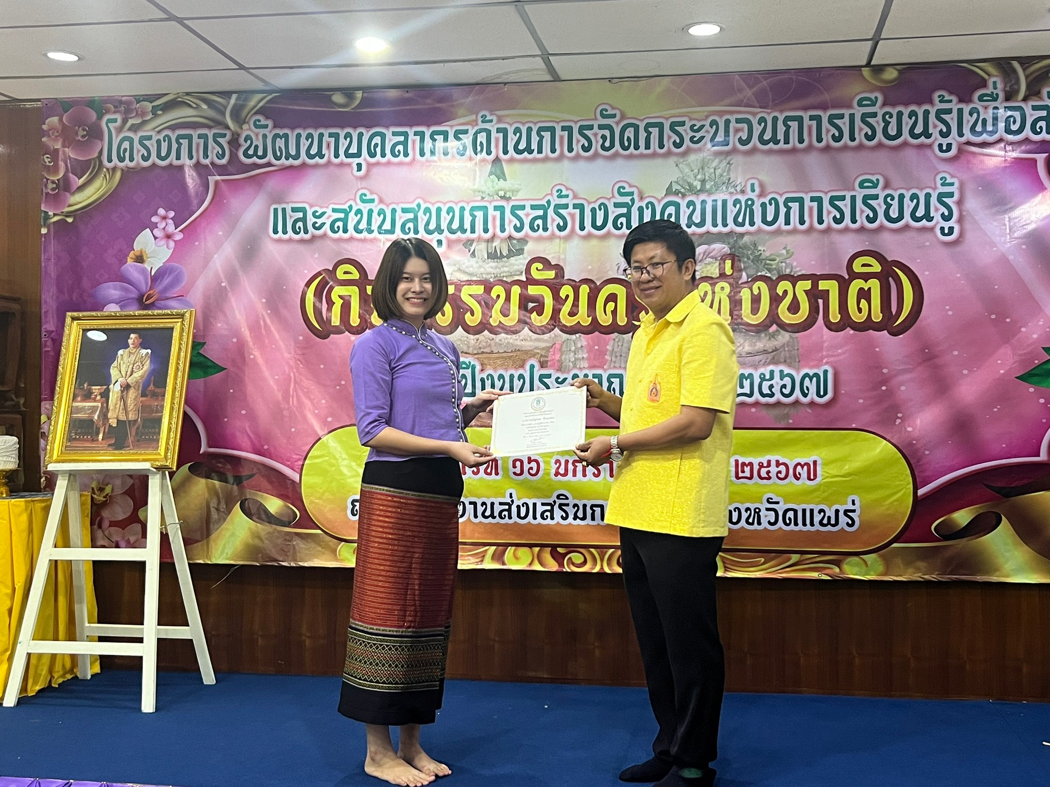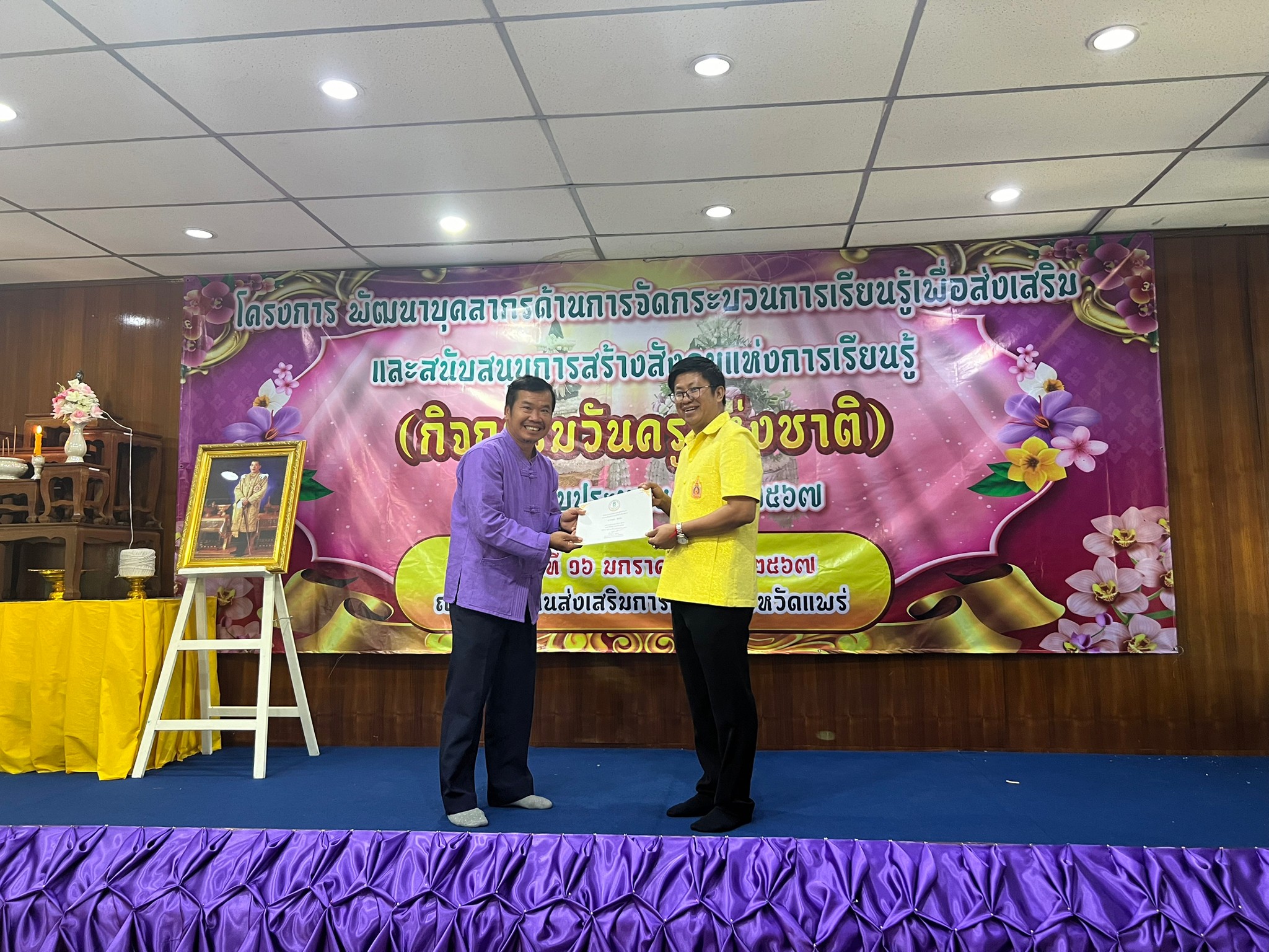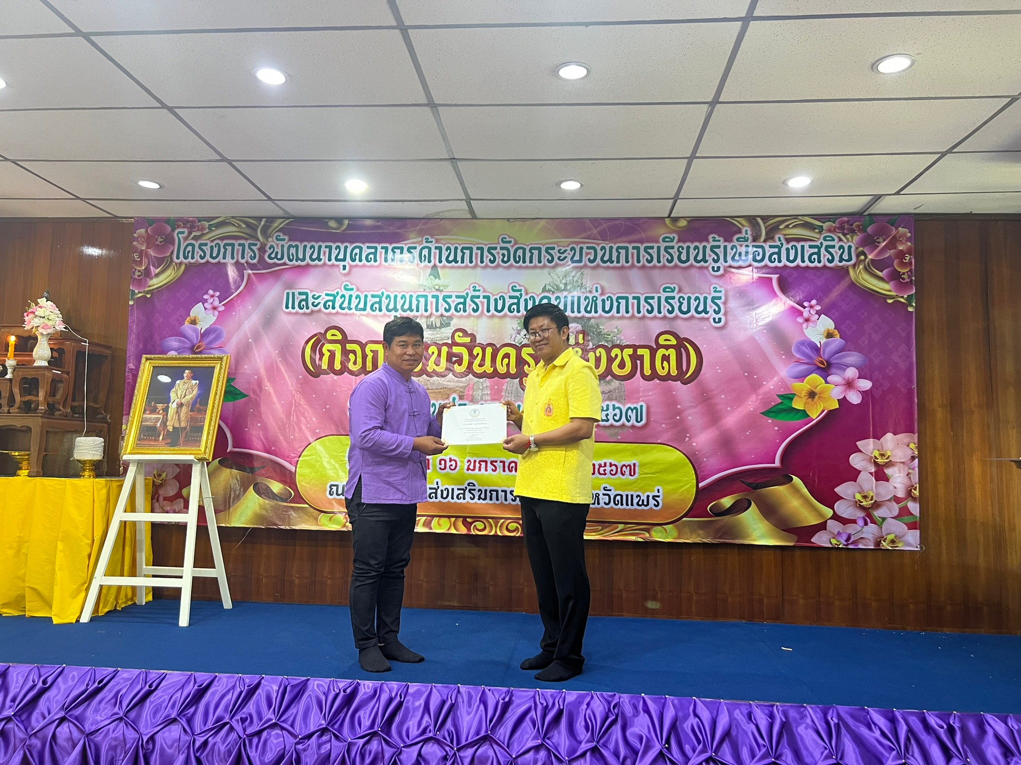 วันที่ 16 มกราคม 2567 นางสาวเสาวนีย์ ชาพัฒิพงศ์ ผอ.กศน.อำเภอเมืองแพร่ ปฏิบัติหน้าที่ ผอ.สกร.อำเภอเมืองแพร่ รักษาการในตำแหน่ง ผอ.สกร.อำเภอลอง มอบหมายให้คณะครูและบุคลากร สกร.อำเภอลอง เข้าร่วมโครงการพัฒนาบุคลากร ด้านการจัดกระบวนการเรียนรู้เพื่อส่งเสริมและสนับสนุน การสร้างสังคมแห่งการเรียนรู้ (กิจกรรมวันครูแห่งชาติ) ประจำปีงบประมาณ2567 พร้อมรับมอบเกียรติบัตรรางวัล สกร.ดีเด่น ให้ผู้บริหารข้าราชการครูและบุคลากรทางการศึกษา และ กิจกรรมนันทนาการพัฒนามนุษย์สัมพันธ์ คณะครูและบุคลากรทางการศึกษา โดยมีนายสมชาย เด็ดขาด ผู้อำนวยการ สกร.จังหวัดแพร่ เป็นประธาน ณ สำนักงานส่งเสริมการเรียนรู้จังหวัดแพร่