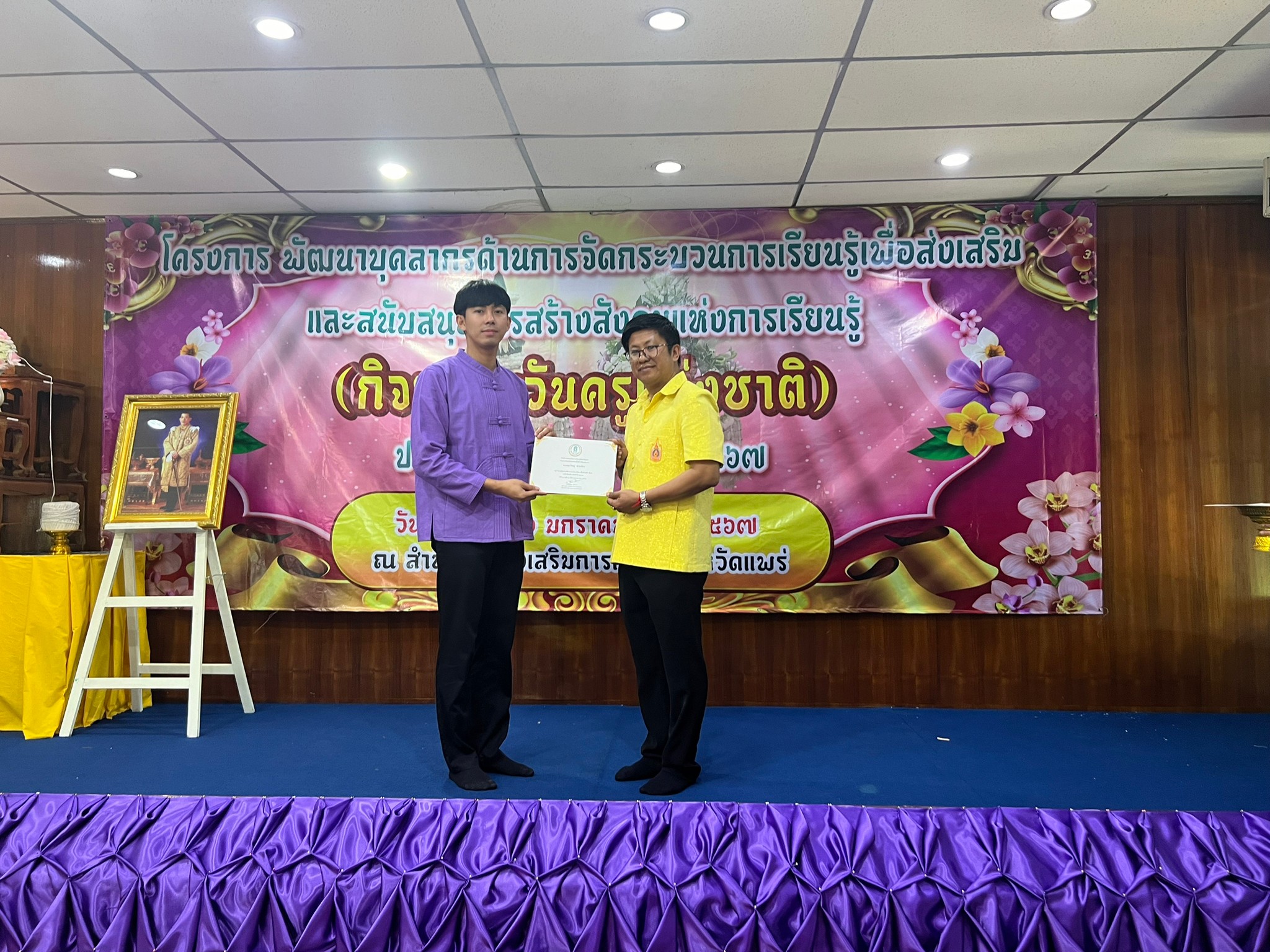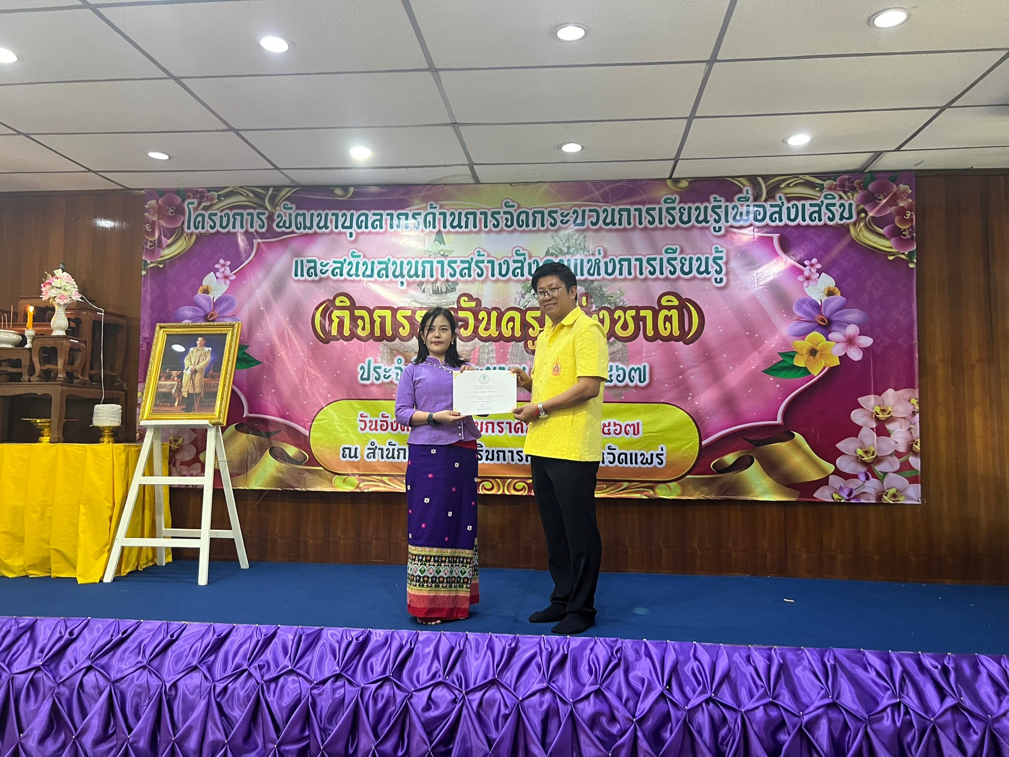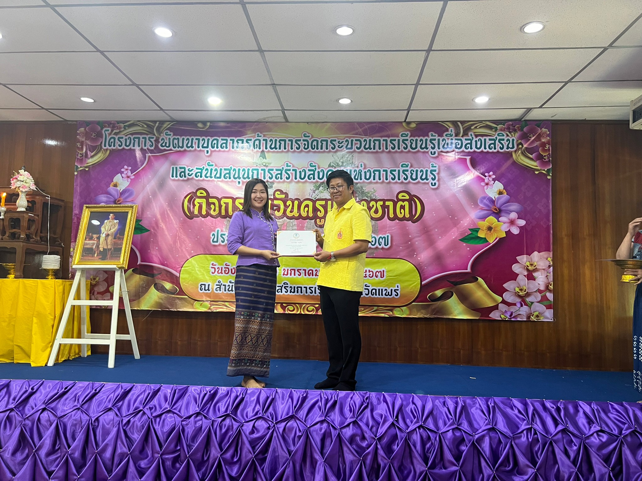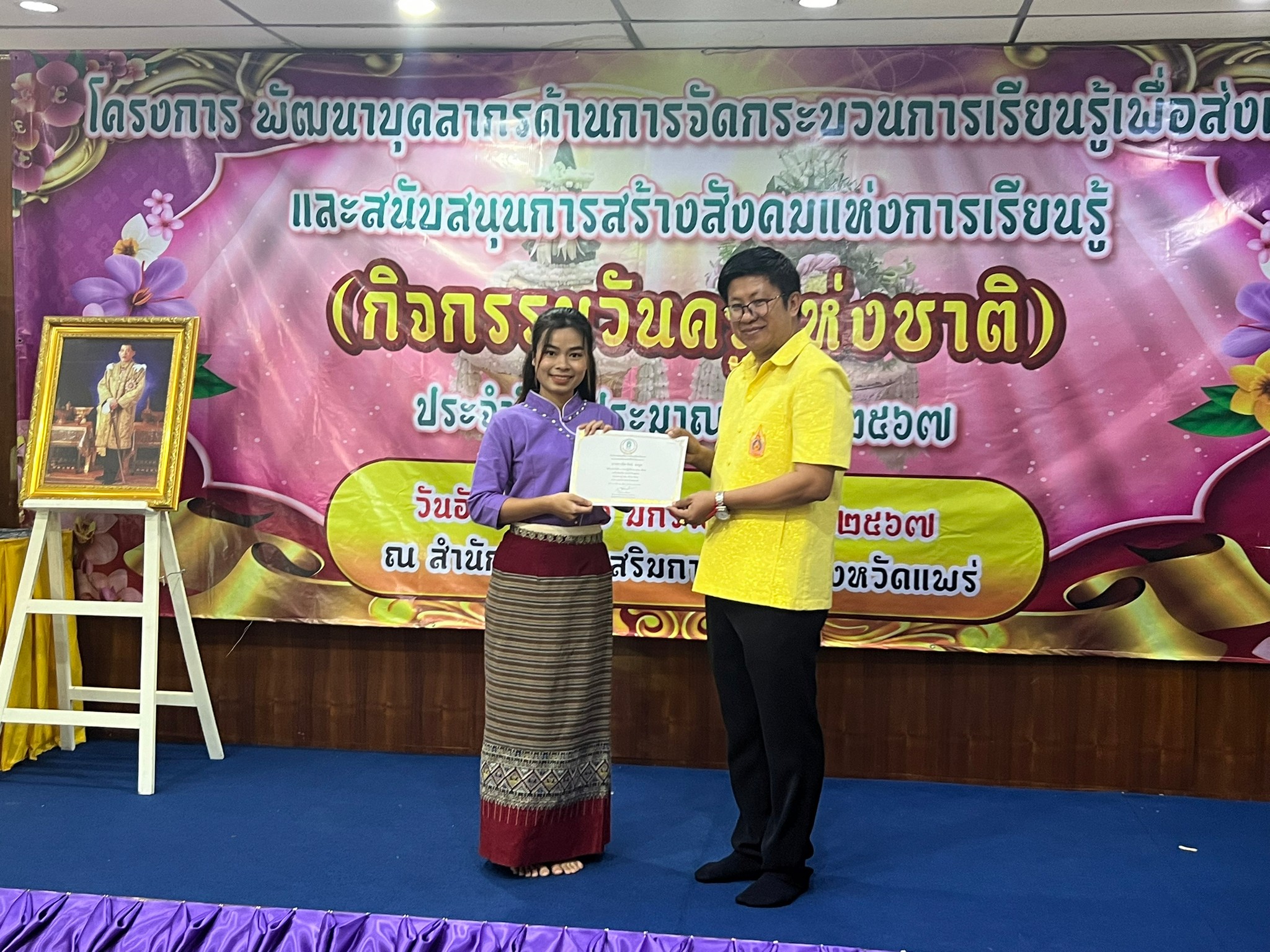 วันที่ 16 มกราคม 2567 นางสาวเสาวนีย์ ชาพัฒิพงศ์ ผอ.กศน.อำเภอเมืองแพร่ ปฏิบัติหน้าที่ ผอ.สกร.อำเภอเมืองแพร่ รักษาการในตำแหน่ง ผอ.สกร.อำเภอลอง มอบหมายให้คณะครูและบุคลากร สกร.อำเภอลอง เข้าร่วมโครงการพัฒนาบุคลากร ด้านการจัดกระบวนการเรียนรู้เพื่อส่งเสริมและสนับสนุน การสร้างสังคมแห่งการเรียนรู้ (กิจกรรมวันครูแห่งชาติ) ประจำปีงบประมาณ2567 พร้อมรับมอบเกียรติบัตรรางวัล สกร.ดีเด่น ให้ผู้บริหารข้าราชการครูและบุคลากรทางการศึกษา และ กิจกรรมนันทนาการพัฒนามนุษย์สัมพันธ์ คณะครูและบุคลากรทางการศึกษา โดยมีนายสมชาย เด็ดขาด ผู้อำนวยการ สกร.จังหวัดแพร่ เป็นประธาน ณ สำนักงานส่งเสริมการเรียนรู้จังหวัดแพร่