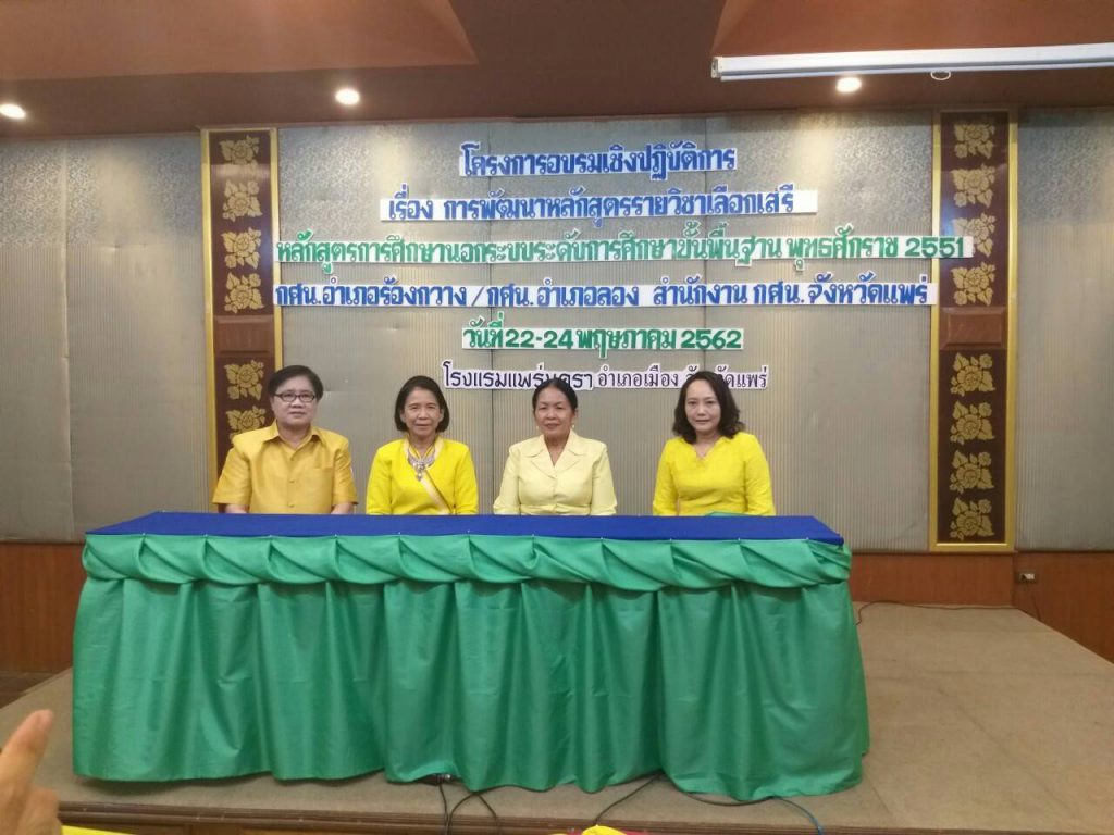 วันที่ 24 พฤษภาคม 2562 กศน.อำเภอลองและ กศน.อำเภอร้องกวางร่วมกันจัดโครงการพัฒนาบุคลากร โครงการอบรมเชิงปฏิบัติการพัฒนาหลักสูตรวิชาเลือกเสรีเรื่อง การพัฒนาหลักสูตรรายวิชาเลือกเสรี หลักสูตร 2551 ระหว่างวันที่ 22-24 พค 2562 โดยมีท่านรองมีนา กิติชานนท์ รองผู้อำนวยการ สำนักงาน กศน.จังหวัดแพร่ ประธานในพิธีเปิดและได้รับเกียรติ จาก วิทยากร คุณอัญชลี ธรรมะวิธีกุล ศึกษานิเทศก์เชียวชาญ ที่มาให้ความรู้