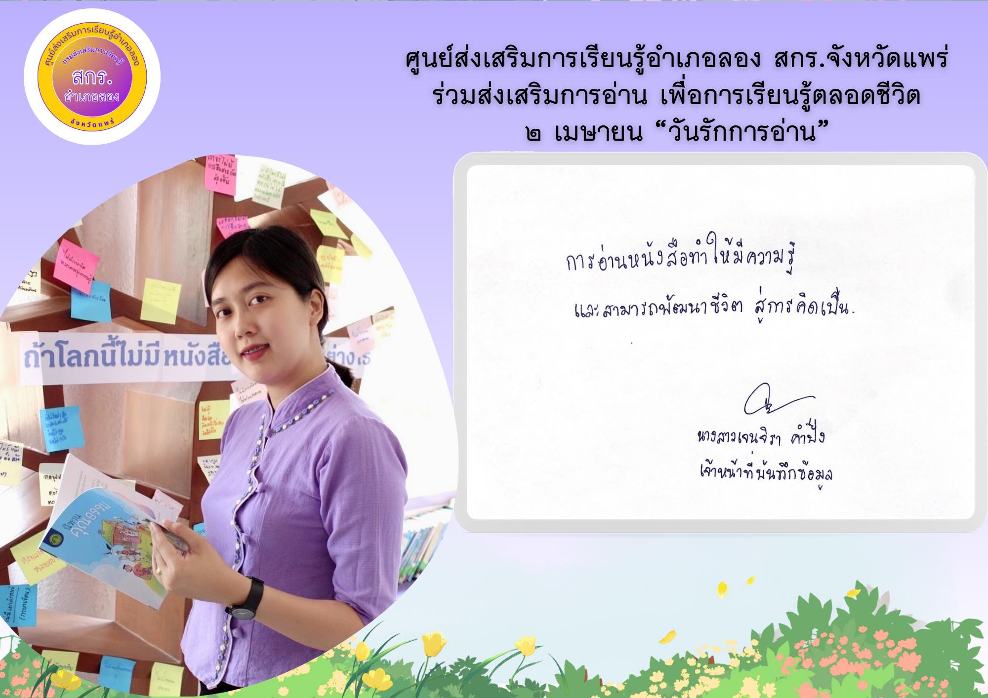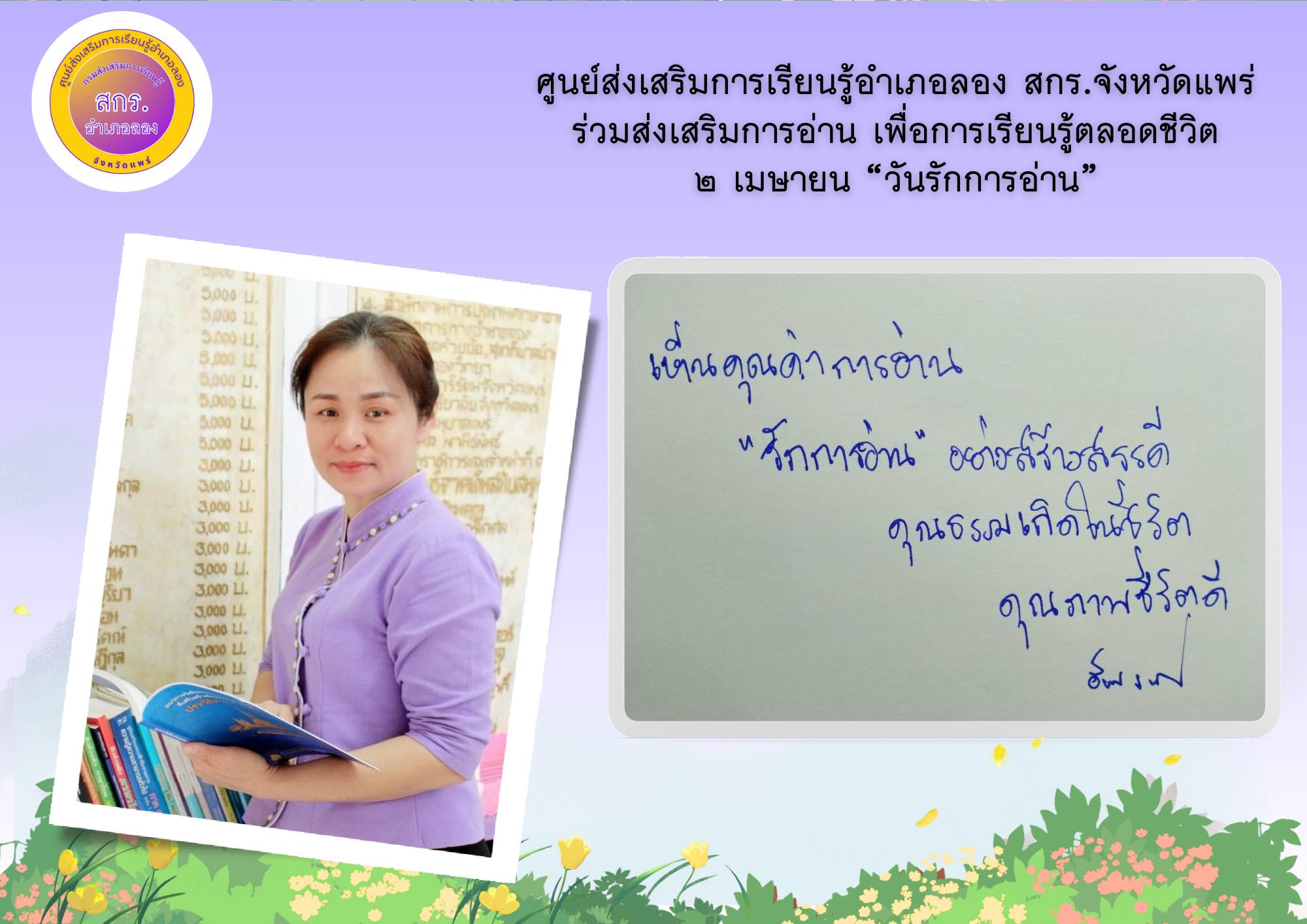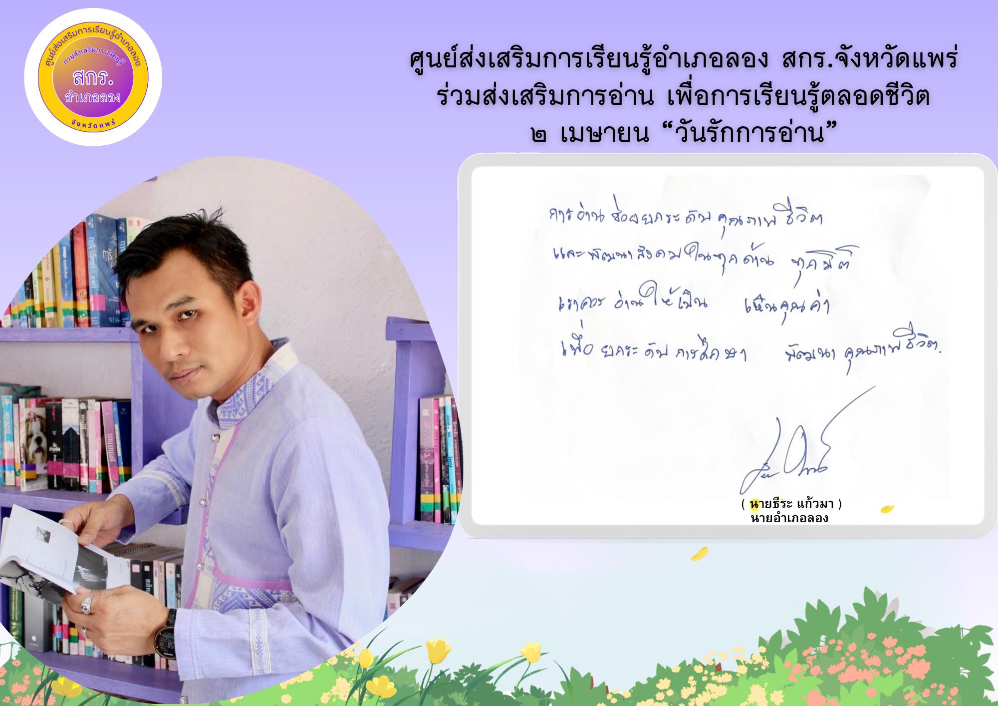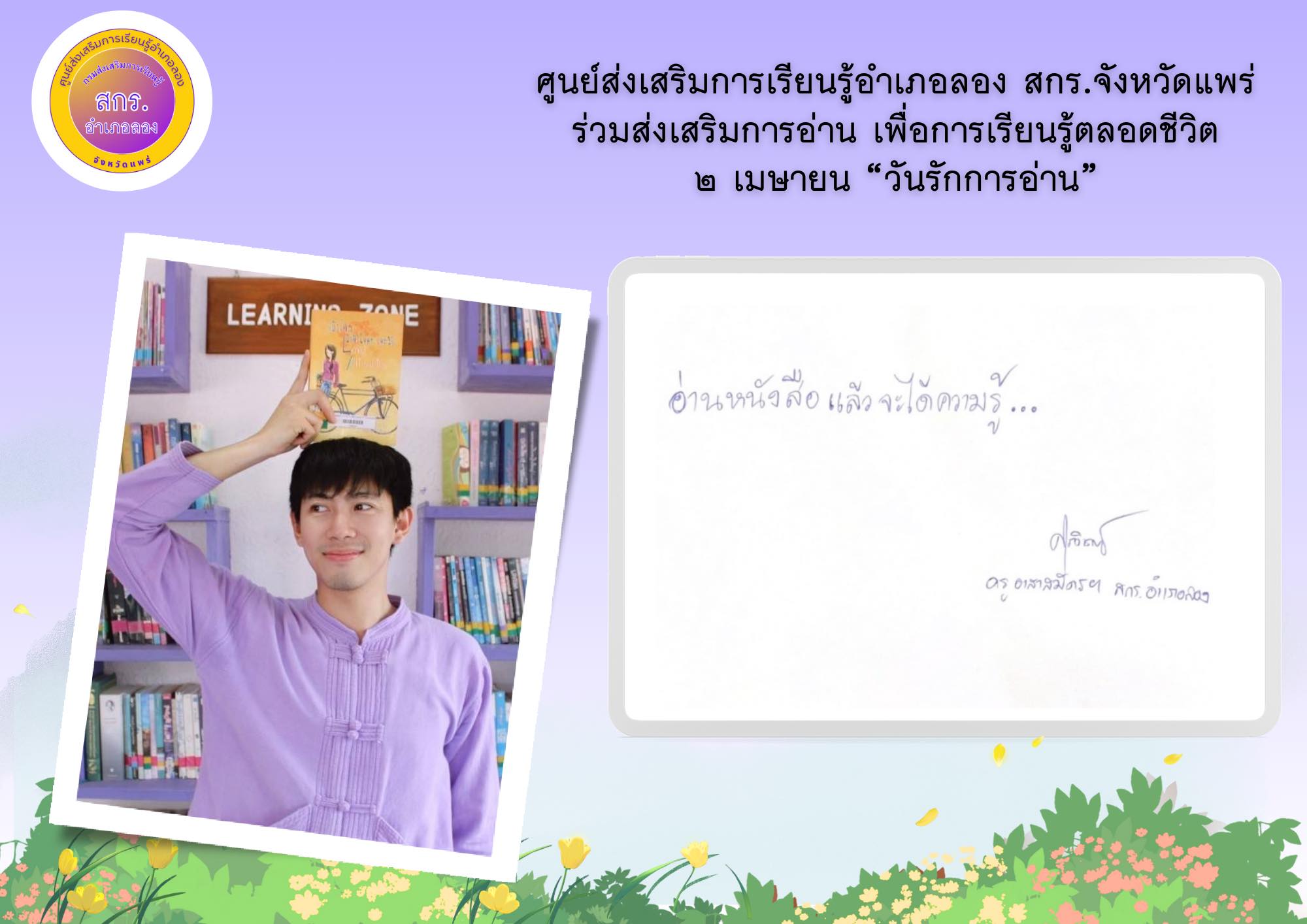 ห้องสมุดประชาชน “เฉลิมราชกุมารี” อำเภอลอง จังหวัดแพร่ จัดกิจกรรม “อ่านบอกรัก” โดยการถ่ายภาพตนเองคู่กับหนังสือเล่มโปรดหรือภาพกิจกรรมการอ่านหนังสือเพื่อบอกเล่าเรื่องราวความรักในการอ่าน “เทิดพระเกียรติสมเด็จพระกนิษฐาธิราชเจ้า กรมสมเด็จพระเทพรัตนราชสุดาฯ สยามบรมราชกุมารี” เนื่องในโอกาสวันคล้ายวันพระราชสมภพ 2 เมษายน 2567 โดยมีนายธีระ แก้วมา นายอำเภอลอง , นางสาวเสาวนีย์ ชาพัฒิพงศ์ ผอ.กศน.อำเภอเมืองแพร่ ปฏิบัติหน้าที่ ผอ.สกร.อำเภอเมืองแพร่ รักษาการในตำแหน่ง ผอ.สกร.อำเภอลอง รวมถึงหัวหน้าส่วนราชการอำเภอลอง และคณะครู บุคลากรศูนย์ส่งเสริมการเรียนรู้อำเภอลอง