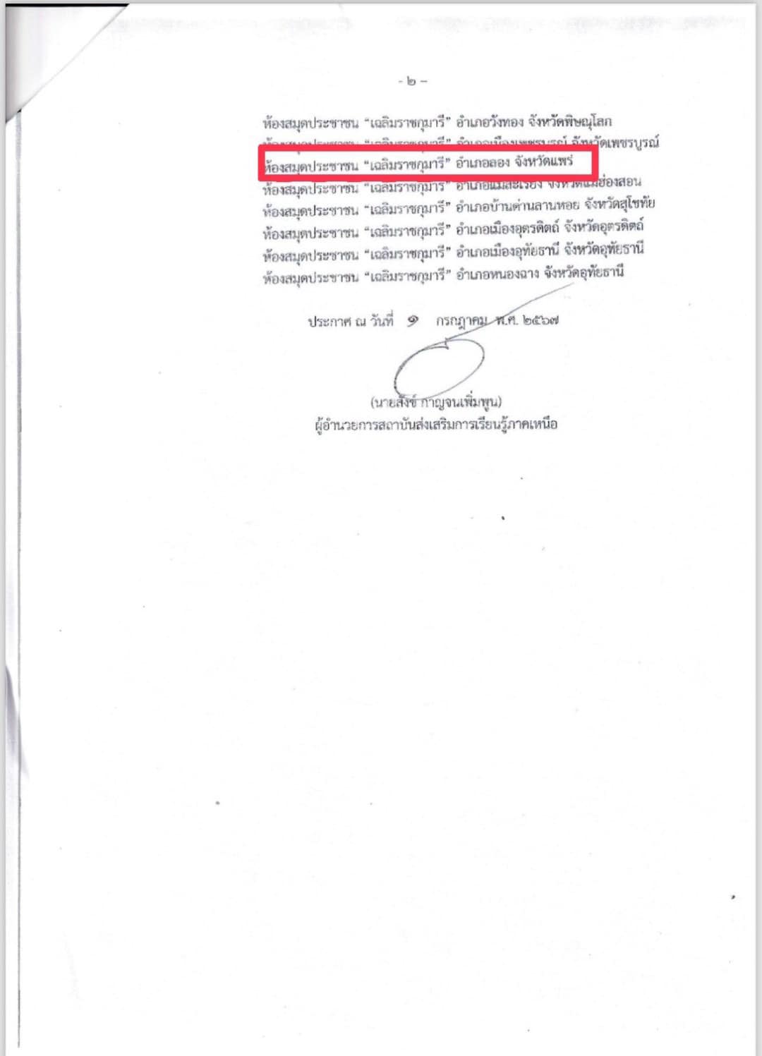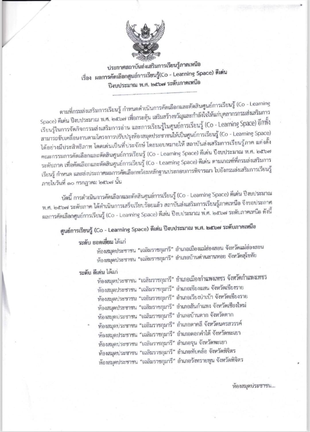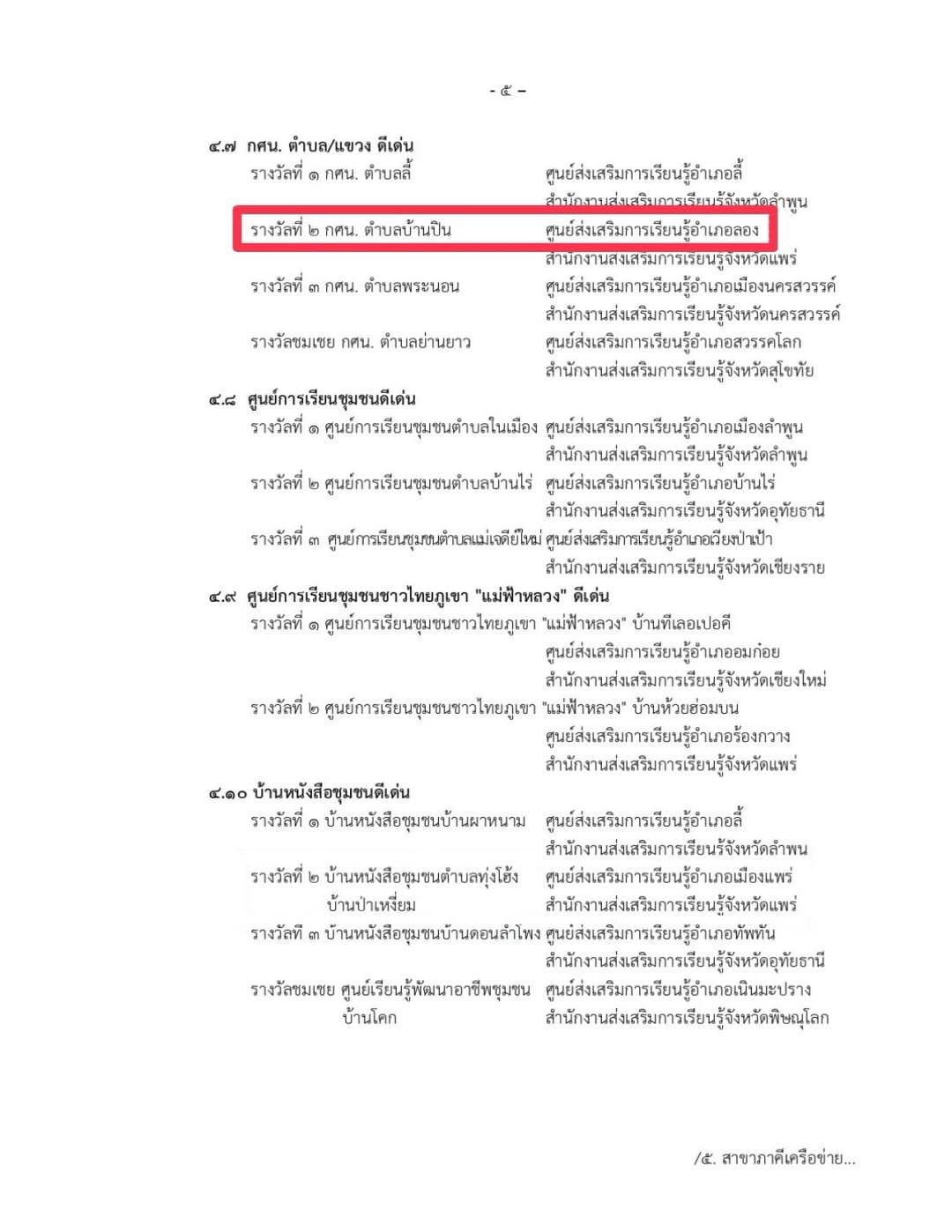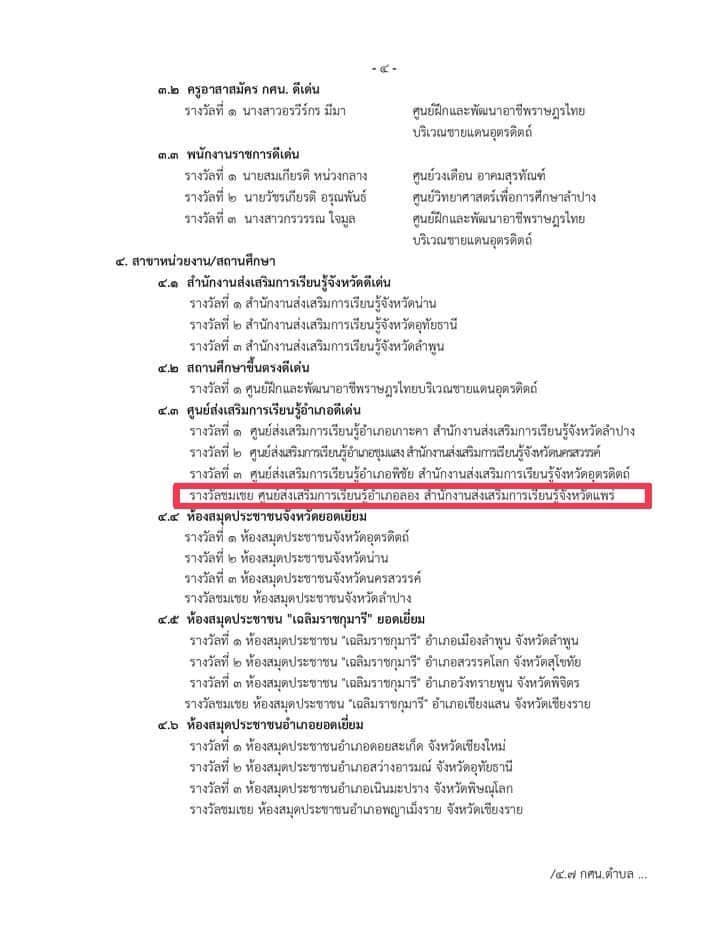 ห้องสมุดประชาชน “เฉลิมราชกุมารี” อำเภอลอง จังหวัดแพร่ ได้รับรางวัล ศูนย์การเรียนรู้ (co – learning space) ระดับดีเด่น , ผลการคัดเลือกการปฏิบัติงาน สกร.ดีเด่น สาขาภาคีเครือข่ายประเภทภูมิปัญญา/ปราชญ์ชาวบ้านดีเด่น ได้รับรางวัลที่ 1 ระดับภาค,กศน.ตำบล/แขวง ดีเด่น รางวัลที่2 กศน.ตำบลบ้านปิน ศูนย์ส่งเสริมการเรียนรู้ระดับอำเภอลอง และรางวัล ที่ 2 ระดับประเทศ นายสุริยา ขันแก้ว และ ประเภทสาขาหน่วยงานการศึกษาศูนย์ส่งเสริมการเรียนรู้อำเภอดีเด่น สกร.ระดับอำเภอลองได้รับรางวัลชมเชยระดับภาค ขอขอบคุณทีมบุคลากร ผู้บริหาร ผู้มีส่วนเกี่ยวข้องกับการขับเคลื่อนฯ และขอขอบคุณ ศูนย์ส่งเสริมการเรียนรู้ประจำจังหวัดแพร่ ที่ให้ความสำคัญกับผลงาน