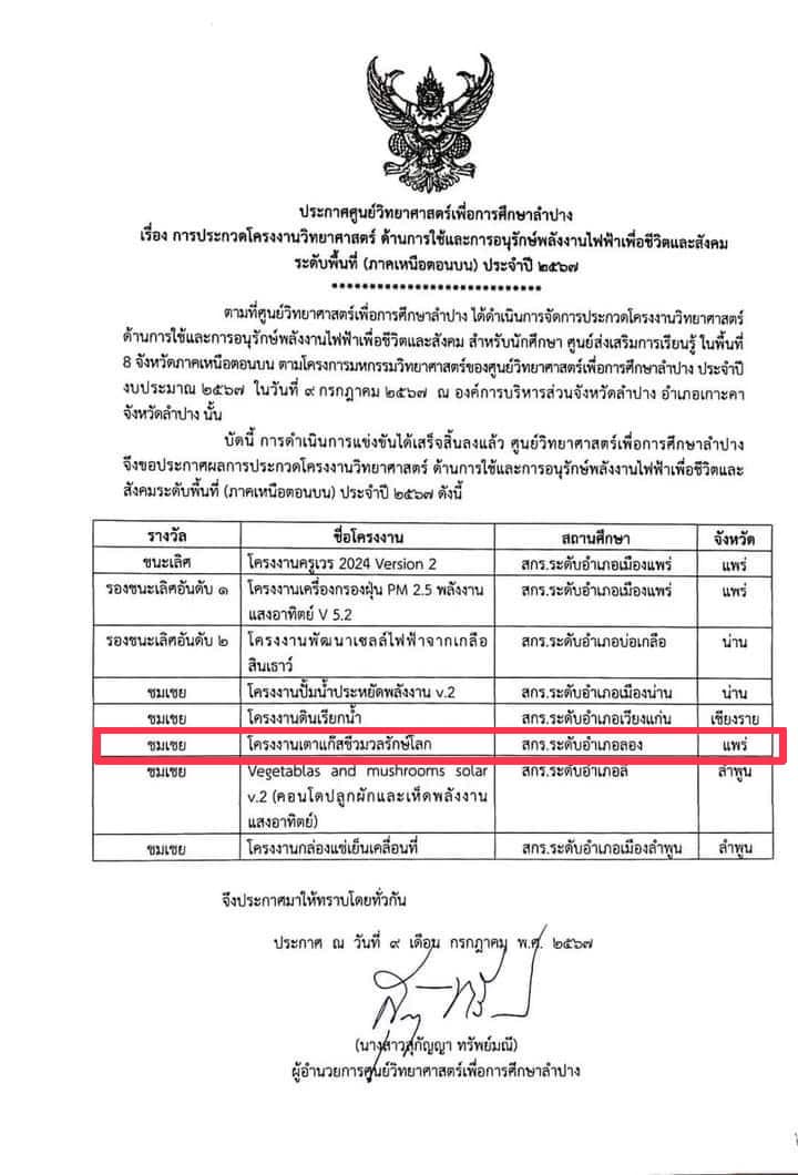 นำโดยนางสาวเสาวนีย์ ชาพัฒิพงศ์ ผอ.กศน.อำเภอเมืองแพร่ ปฏิบัติหน้าที่ ผอ.สกร.ระดับอำเภอเมืองแพร่ รักษาการในตำแหน่ง ผอ.สกร.ระดับอำเภอลอง พร้อมด้วย นางสาวรัชนีกร พิมสาร ครู และนายศุภวิชญ์ สวนจักร ครูอาสาฯ นำนักศึกษา สกร.ระดับอำเภอลองเข้าร่วมการประกวดโครงงานวิทยาศาสตร์ ระดับพื้นที่ ประจำปี 2567 ด้านการใช้และการอนุรักษ์พลังงานไฟฟ้าเพื่อชีวิตและสังคม โครงงานเตาแก๊สชีวมวลรักษ์โลก โดยการนำเสนอต่อคณะกรรมการ เพื่อคัดเลือกเป็นตัวแทนในระดับภาคเหนือ ได้รับรางวัลชมเชย ณ ศูนย์วิทยาศาสตร์เพื่อการศึกษาลำปาง จังหวัดลำปาง