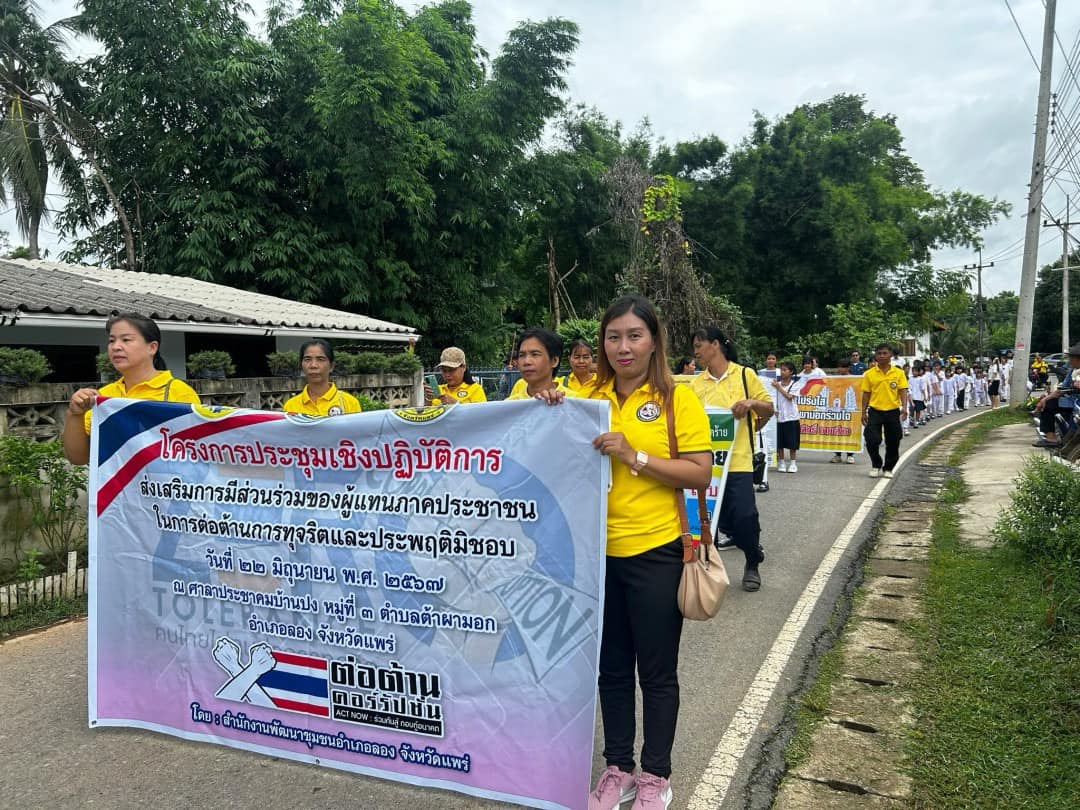 นางสาวเสาวนีย์ ชาพัฒิพงศ์ ผอ.กศน.อำเภอเมืองแพร่ ปฏิบัติหน้าที่ ผอ.สกร.ระดับอำเภอเมืองแพร่ รักษาการในตำแหน่ง ผอ.สกร.ระดับอำเภอลอง มอบหมายให้นางสาวธิดารัตน์ ละมูล ครู กศน.ตำบลต้าผามอก และนายศุภวิชญ์ สวนจักร ครู อาสาสมัครฯ ร่วมกับศูนย์ส่งเสริมพัฒนาประชาธิปไตยตำบลต้าผามอก พัฒนาชุมชนอำเภอลอง อบต.ต้าผามอก โรงเรียนบ้านปง ผู้นำชุมชนและชาวบ้านบ้านปง เดินรณรงค์ต่อต้านการทุจริต ณ บ้านปง ตำบลต้าผามอก อำเภอลอง จังหวัดแพร่