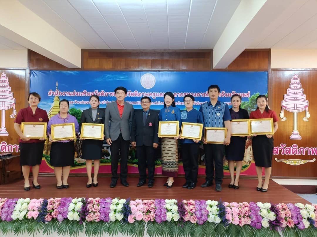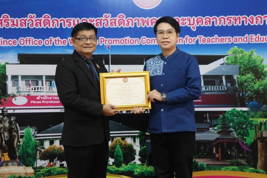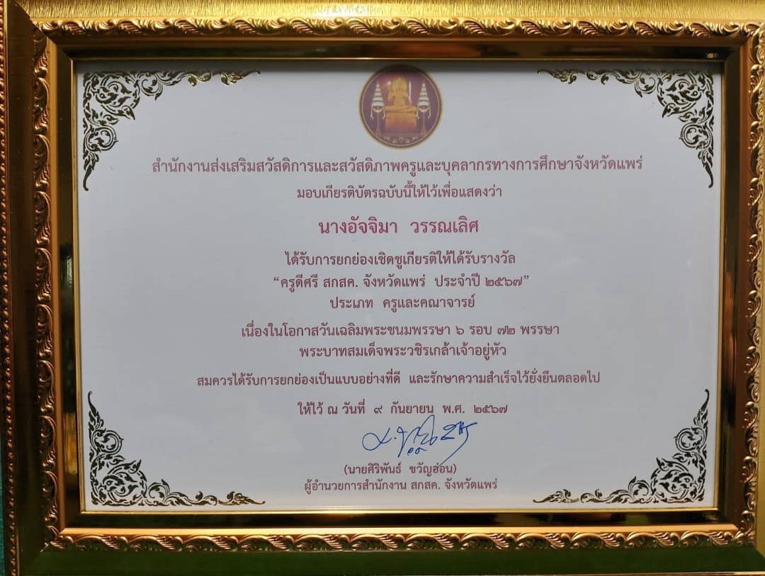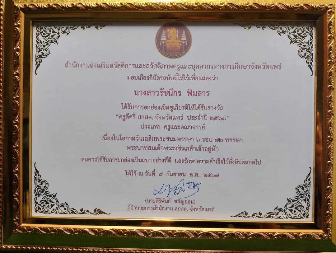 นางสาวรัชนีกร พิมสาร ครู และ นางอัจจิมา วรรณเลิศ ครู เข้ารับรางวัล “ครูดีศรี สกสค.จังหวัดแพร่ ประจำปี 2567” ประเภทครูและคณาจารย์ เนื่องในโอกาสวันเฉลิมพระชนม์พรรษา 6รอบ72พรรษา พระบาทสมเด็จพระวชิรเกล้าเจ้าอยู่หัว ณ สำนักงาน สกสค.จังหวัดแพร่