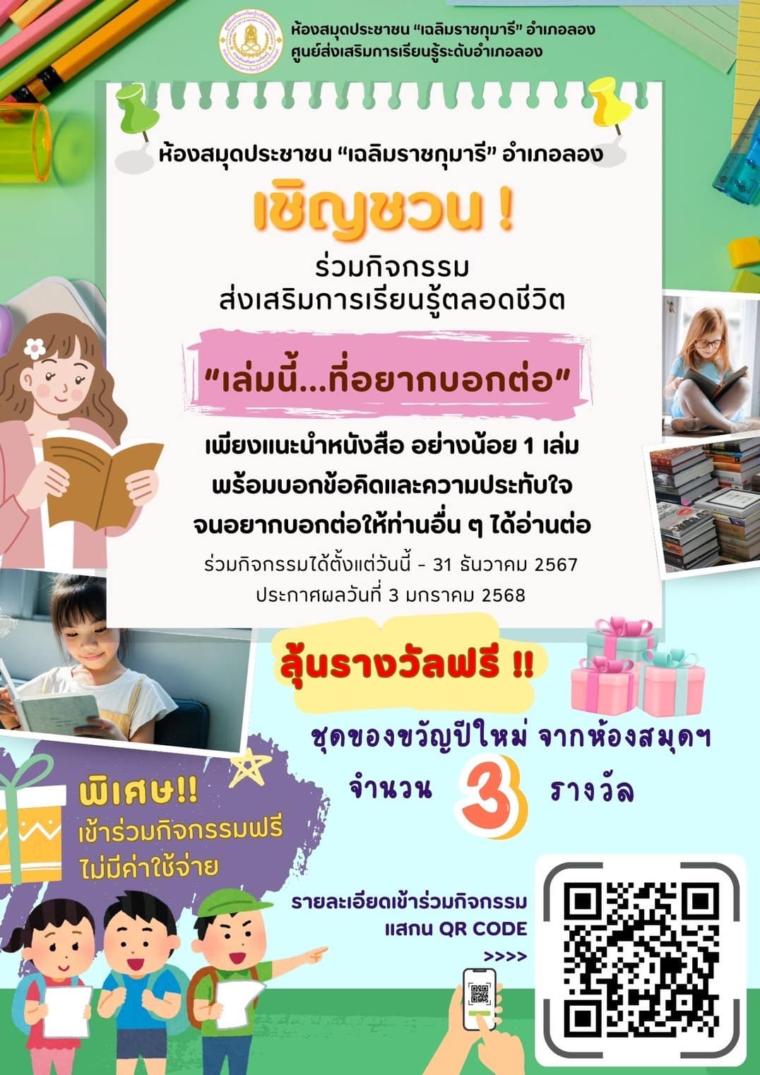 4. ประกาศรายชื่อผู้โชคดี วันที่ 3 มกราคม 2568 ที่ Facebook:ห้องสมุดประชาชน เฉลิมราชกุมารี อ.ลอง จ.แพร่