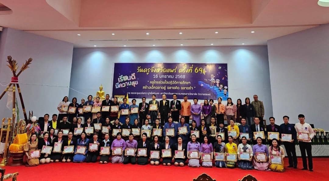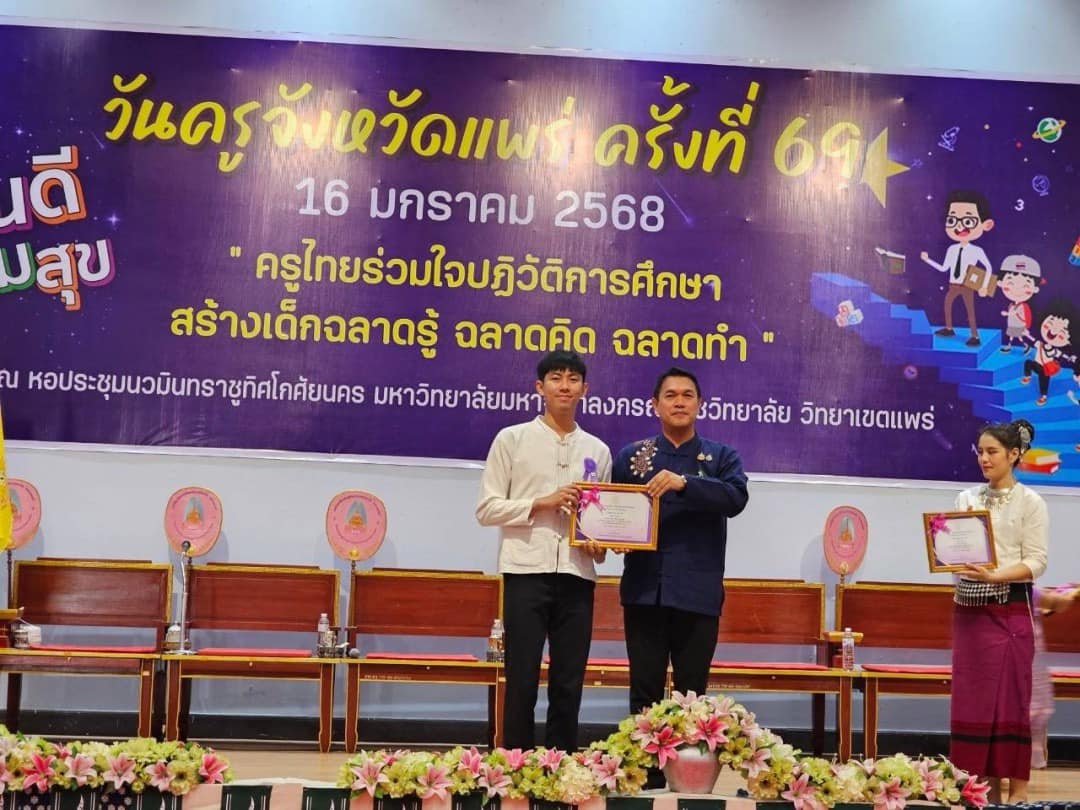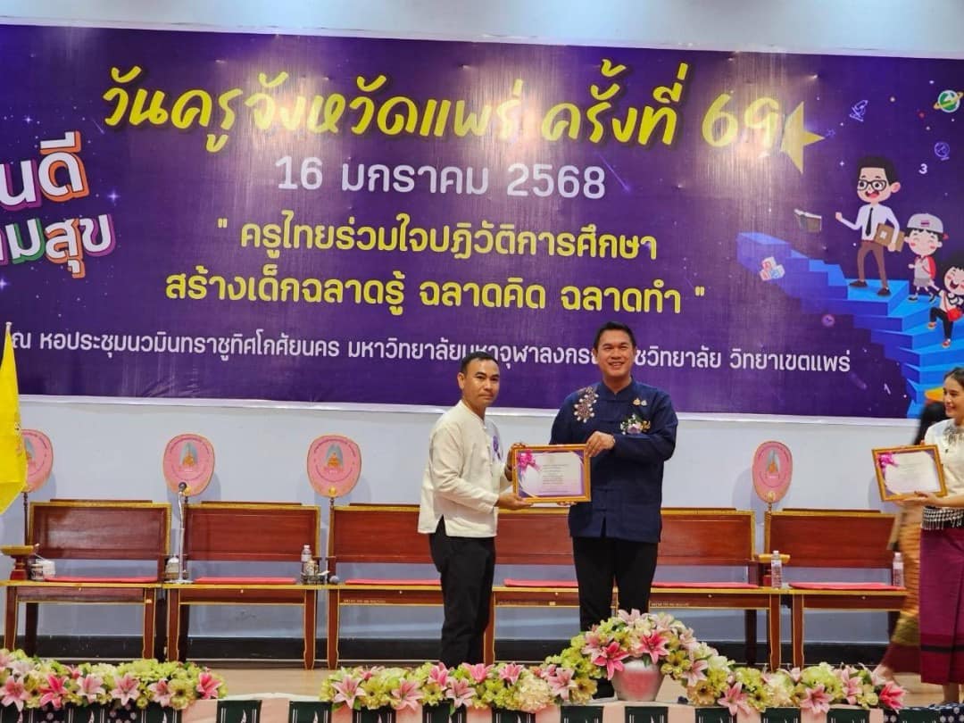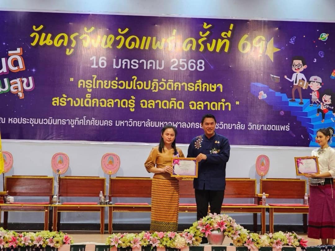 วันที่ 16 มกราคม พ.ศ.2568 เข้าร่วมรับมอบเกียรติบัตร ในพิธี “วันครูจังหวัดแพร่ ครั้งที่ ๖๙ ” และรับมอบเกียรติบัตรรางวัลที่ 1 สาขาหน่วยงานการศึกษา/สถานศึกษา ประเภทศูนย์ส่งเสริมการเรียนรู้ระดับอำเภอดีเด่น นางอัจจิมา วรรณเลิศ ครูศูนย์ส่งเสริมการเรียนรู้ระดับอำเภอลอง , รางวัลที่ 1 สาขาบุคลากร ประเภทครูอาสาสมัคร กศน. ดีเด่น นายศุภวิชญ์ สวนจักร ครูอาสาสมัครการศึกษานอกโรงเรียน (พื้นที่ปกติ), รางวัลที่ 1 สาขาหน่วยงานการศึกษา/สถานศึกษา ประเภทศูนย์ส่งเสริมการเรียนรู้ระดับตำบลดีเด่น นายภาสกร ถาเงิน ครู กศน.ตำบลบ้านปิน และ รางวัลที่ 1 สาขาภาคีเครือข่าย ประเภทภูมิปัญญา/ปราชญ์ชาวบ้านดีเด่น นางสาววณิชยา พิพิธทอง ครู กศน.ตำบล (ชื่อในเกียรติบัตร นางหทัยรัตน์ ขันแก้ว) ณ หอประชุมนวมินทราชูทิศโกศัยนครมหาวิทยาลัยมหาจุฬาลงกรณราชวิทยาลัย วิทยาเขตแพร่ อำเภอเมืองแพร่ จังหวัดแพร่
