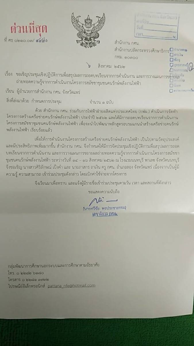 นางสาวรติรัตน์ อินต์ธะวิชัย ผอ.กศน.อำเภอลอง มอบหมายให้ นายภาสกร ถาเงิน ครู กศน.ตำบลบ้านปิน และ นางสาวสิริลักษณ์ เป็งคำ ครู กศน.ตำบลแม่ปาน เข้าร่วมประชุมเชิงปฏิบัติการเพื่อสรุปผลการถอดบทเรียนจากการดำเนินงานและการวางแผนการขยายผลถ่ายทอดความรู้จากการดำเนิน”โครงการสมัชชาชุมชนคนรักษ์พลังงานไฟฟ้า” ณ ห้องทัศนาบุรี โรงแรมนนทบุรีพาเลซ จังหวัดนนทบุรี