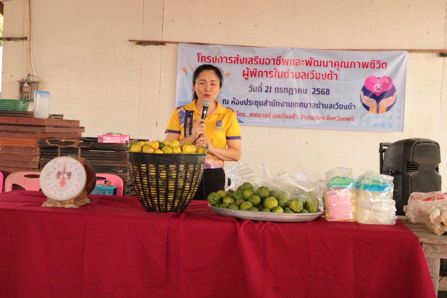 นางอัจจิมา วรรณเลิศ ครูรักษาการในตำแหน่งผู้อำนวยการ สกร.ระดับอำเภอลอง เข้าร่วมเป็นวิทยากรในโครงการส่งเสริมอาชีพและพัฒนาคุณภาพชีวิตผู้พิการในตำบลเวียงต้า ประจำปีงบประมาณ พ.ศ. 2568 ณ ห้องประชุมเทศบาลตำบลเวียงต้า ต.เวียงต้า อ.ลอง จ.แพร่