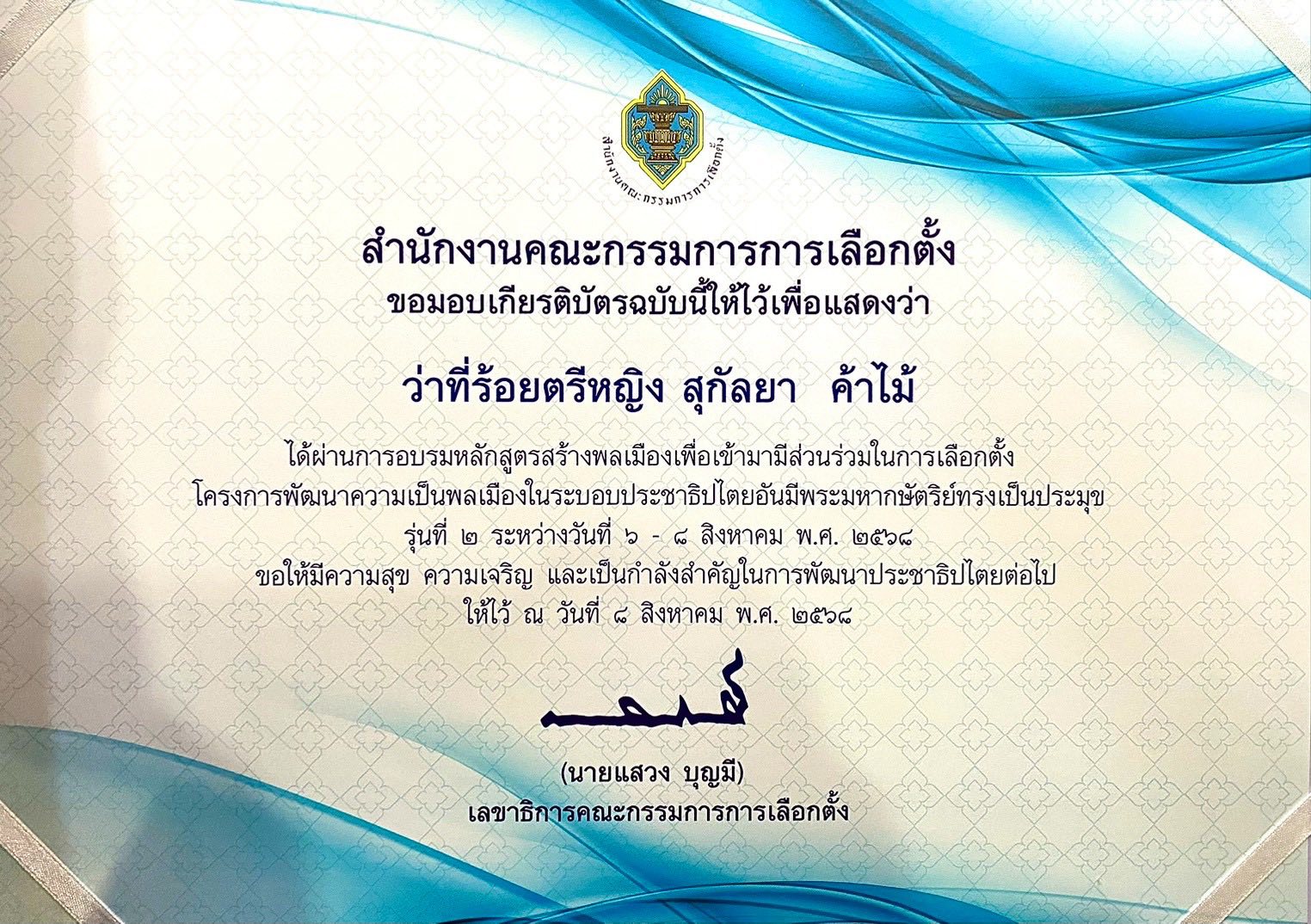 วันที่ 6-8 สิงหาคม พ.ศ.2568 นางอัจจิมา วรรณเลิศ ครู รักษาการในตำแหน่ง ผอ.สกร.ระดับบอำเภอลอง มอบหมายให้ ว่าที่ร.ต.หญิง สุกัลยา ค้าไม้ ครูศูนย์การเรียนรู้ เข้ารับการอบรมหลักสูตรสร้างพลเมืองเพื่อเข้ามามีส่วนร่วมในการเลือกตั้ง โครงการพัฒนาความเป็นพลเมืองในระบอบประชาธิปไตยอันมีพระมหากษัตริย์ทรงเป็นประมุข รุ่นที่ 2 ณ โรงแรมเชียงใหม่ออคิด จังหวัดเชียงใหม่