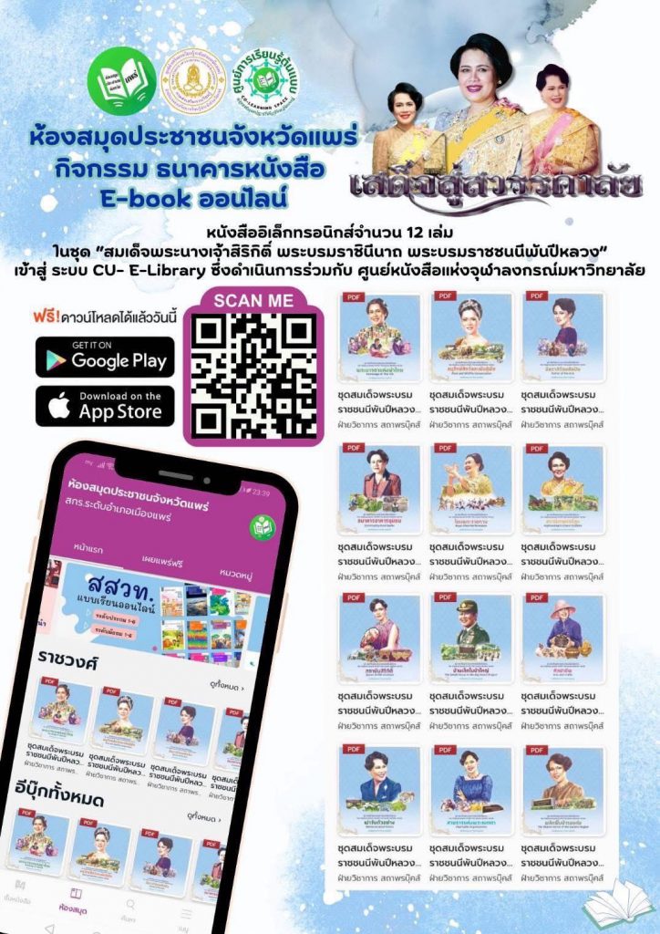 ประชาสัมพันธ์ ห้องสมุดประชาชนจังหวัดแพร่ สกร.ประจำจังหวัดแพร่ นำเข้าหนังสืออิเล็กทรอนิกส์จำนวน 12 เล่ม ในชุด “สมเด็จพระนางเจ้าสิริกิติ์ พระบรมราชินีนาถ พระบรมราชชนนีพันปีหลวง” เข้าสู่ ระบบ CU- E-Library ซึ่งดำเนินการร่วมกับ ศูนย์หนังสือแห่งจุฬาลงกรณ์มหาวิทยาลัย และห้องสมุดดิจิทัล E-LIBRARY ห้องสมุดประชาชน “เฉลิมราชกุมารี” อำเภอลอง E-BOOK EVERYWHERE เปิดโลกการอ่านเพราะทุกที่คือการเรียนรู้ตลอดชีวิต ยืมหนังสือออนไลน์ง่ายๆ ผ่าน CU eLibrary ณ ห้องสมุดเคลื่อนที่สถานีรถไฟบ้านปิน อ.ลอง จ.แพร่