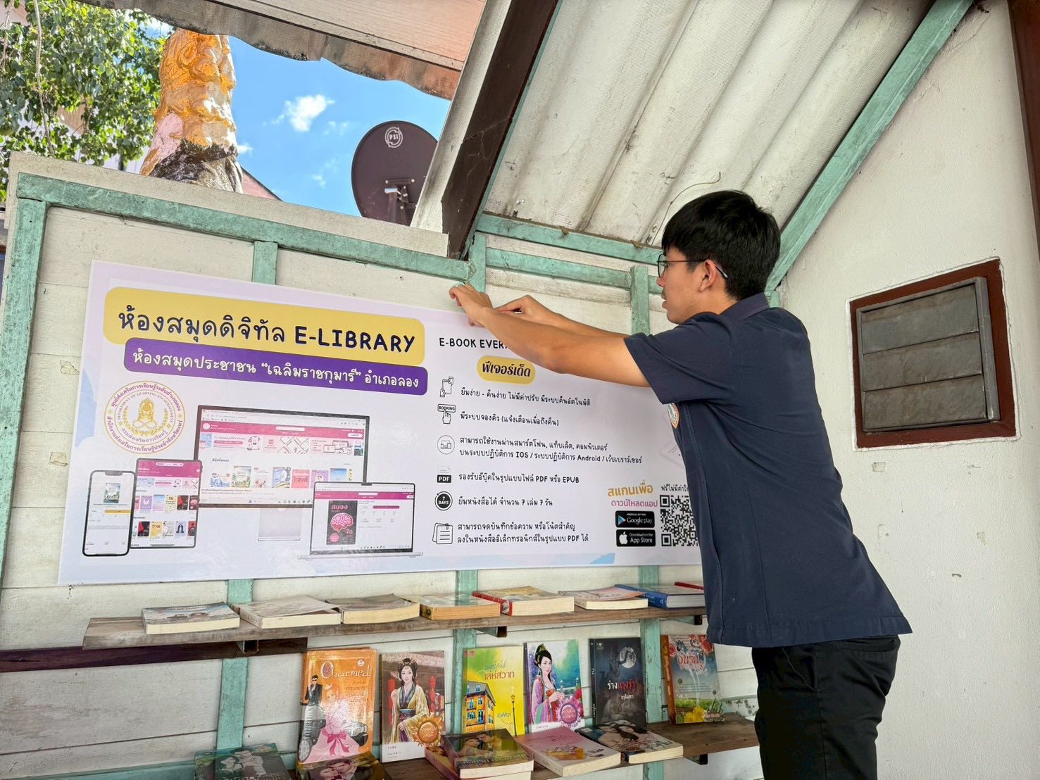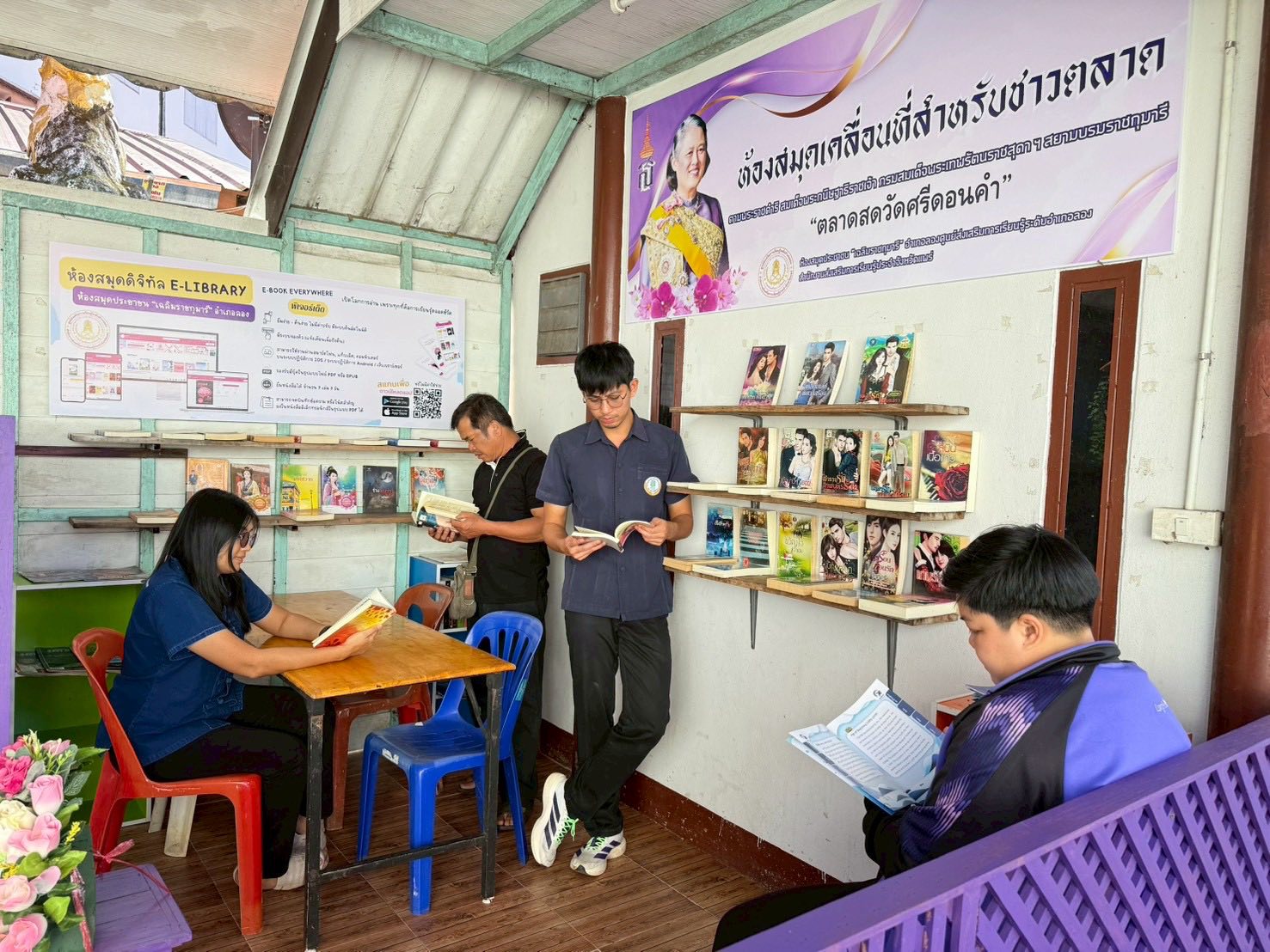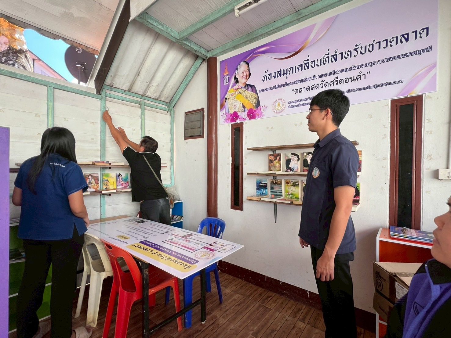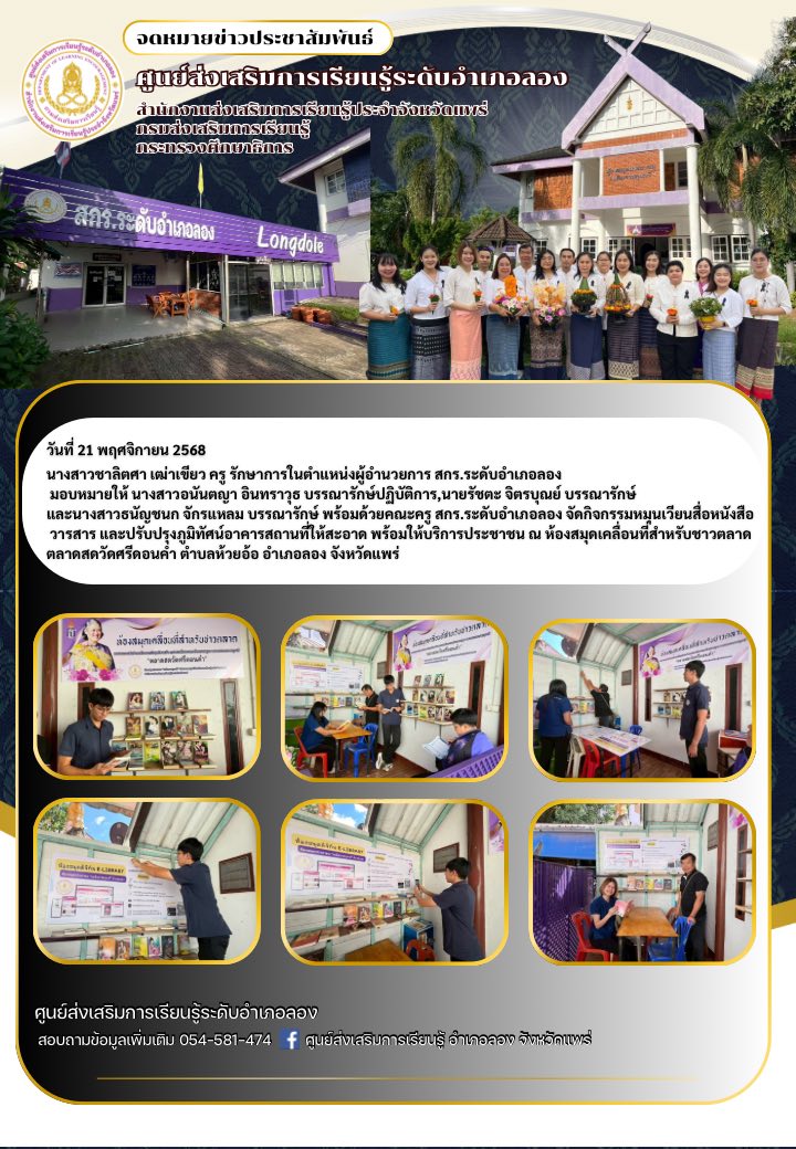 นางสาวชาลิตศา เฒ่าเขียว ครู รักษาการในตำแหน่งผู้อำนวยการ สกร.ระดับอำเภอลอง มอบหมายให้นางสาวอนันตญา อินทราวุธ บรรณารักษ์ปฏิบัติการ,นายรัชตะ จิตรบุณย์ บรรณารักษ์ และนางสาวธนัญชนก จักรแหลม บรรณารักษ์ พร้อมด้วยคณะครู สกร.ระดับอำเภอลอง จัดกิจกรรมหมุนเวียนสื่อหนังสือ วารสาร และปรับปรุงภูมิทัศน์อาคารสถานที่ให้สะอาด พร้อมให้บริการประชาชน ณ ห้องสมุดเคลื่อนที่สำหรับชาวตลาด ตลาดสดวัดศรีดอนคำ ตำบลห้วยอ้อ อำเภอลอง จังหวัดแพร่