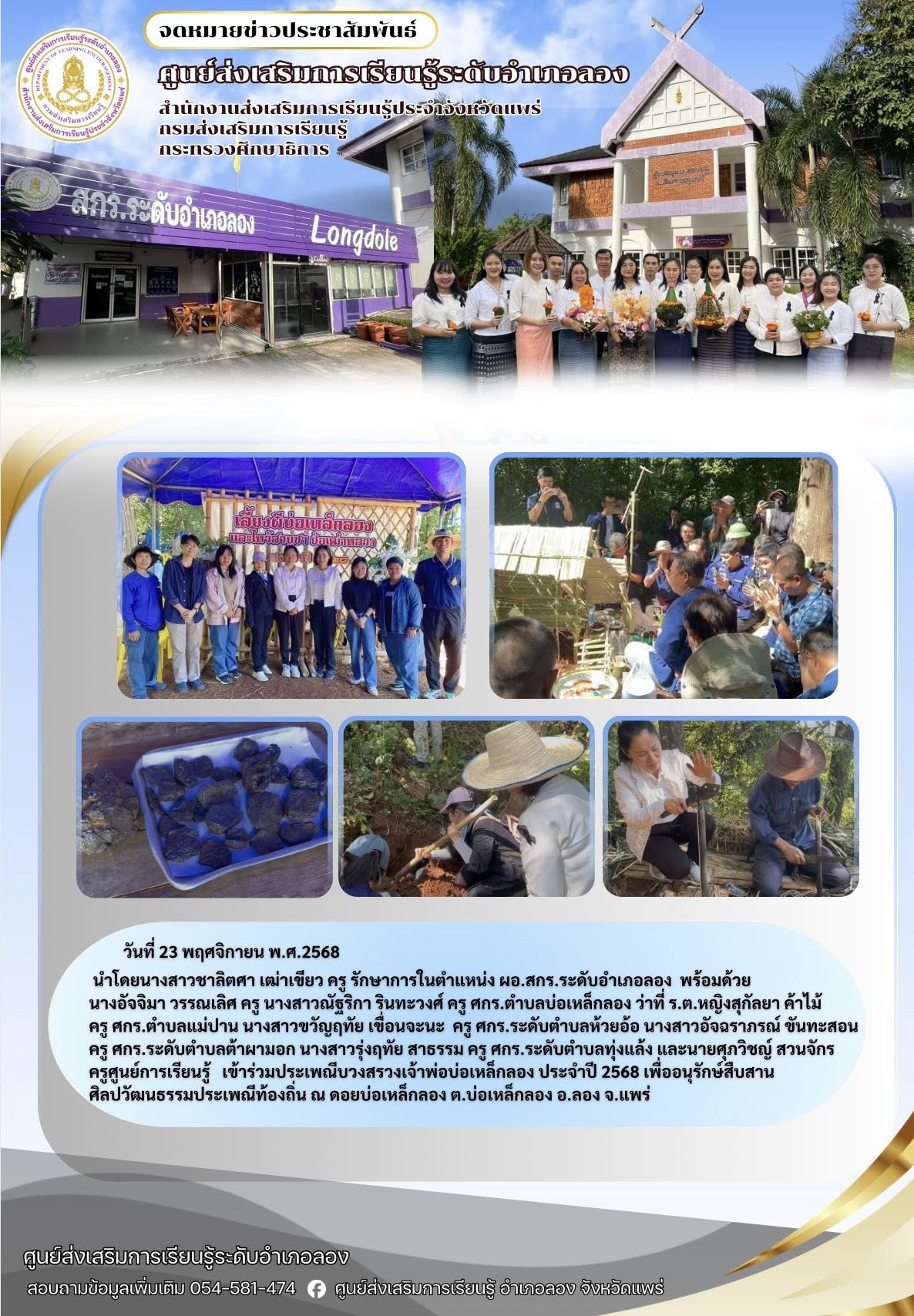 นำโดยนางสาวชาลิตศา เฒ่าเขียว ครู รักษาการในตำแหน่ง ผอ.สกร.ระดับอำเภอลอง พร้อมด้วยนางอัจจิมา วรรณเลิศ ครู นางสาวณัฐริกา รินทะวงศ์ ครู ศกร.ตำบลบ่อเหล็กลอง ว่าที่ ร.ต.หญิงสุกัลยา ค้าไม้ ครู ศกร.ตำบลแม่ปาน นางสาวขวัญฤทัย เขื่อนจะนะ ครู ศกร.ระดับตำบลห้วยอ้อ นางสาวอัจฉราภรณ์ ขันทะสอนครู ศกร.ระดับตำบลต้าผามอก นางสาวรุ่งฤทัย สาธรรม ครู ศกร.ระดับตำบลทุ่งแล้ง และนายศุภวิชญ์ สวนจักร ครูศูนย์การเรียนรู้ เข้าร่วมประเพณีบวงสรวงเจ้าพ่อบ่อเหล็กลอง ประจำปี 2568 เพื่ออนุรักษ์สืบสานศิลปวัฒนธรรมประเพณีท้องถิ่น ณ ดอยบ่อเหล็กลอง ต.บ่อเหล็กลอง อ.ลอง จ.แพร่