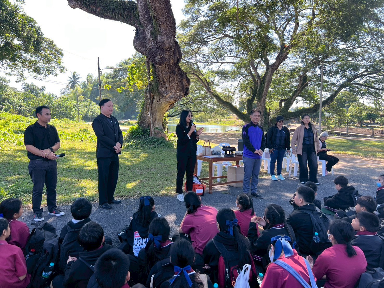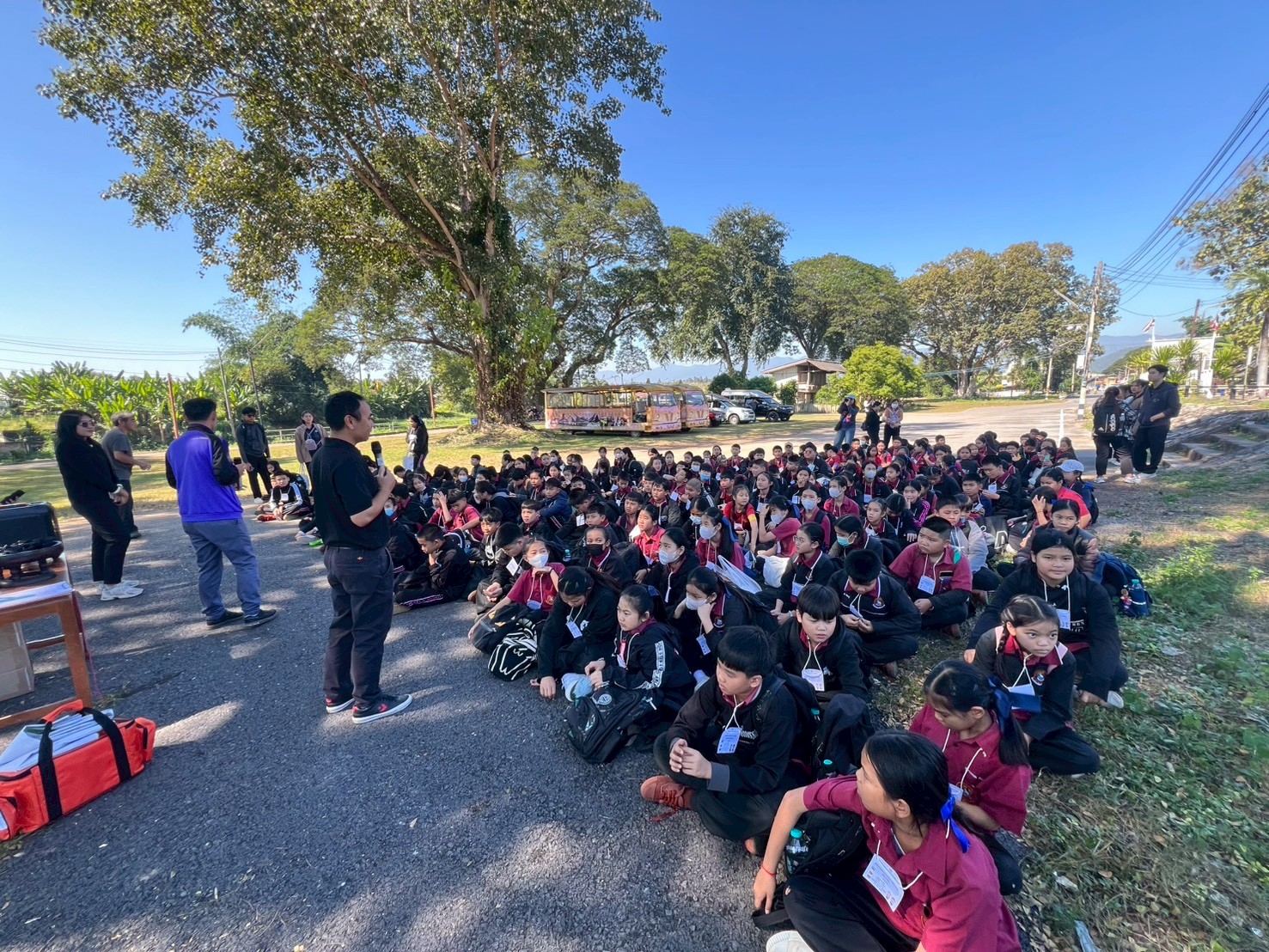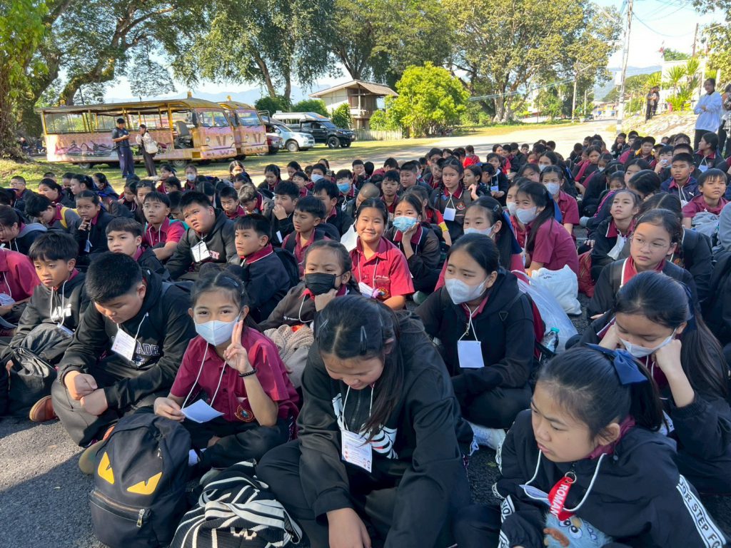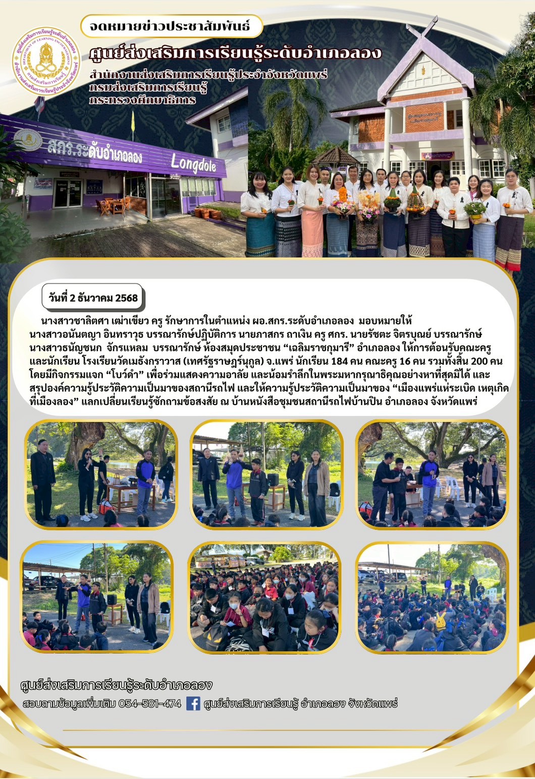 นางสาวชาลิตศา เฒ่าเขียว ครู รักษาการในตำแหน่ง ผอ.สกร.ระดับอำเภอลอง มอบหมายให้นางสาวอนันตญา อินทราวุธ บรรณารักษ์ปฏิบัติการ นายภาสกร ถาเงิน ครู ศกร. นายรัชตะ จิตรบุณย์ บรรณารักษ์ นางสาวธนัญชนก จักรแหลม บรรณารักษ์ ห้องสมุดประชาชน “เฉลิมราชกุมารี” อำเภอลอง จ.แพร่ นักเรียน 184 คน คณะครู 16 คน รวมทั้งสิ้น 200 คนโดยมีกิจกรรมแจก “โบว์ดำ” เพื่อร่วมแสดงความอาลัย และน้อมรำลึกในพระมหากรุณาธิคุณอย่างหาที่สุดมิได้ และสรุปองค์ความรู้ประวัติความเป็นมาของสถานีรถไฟ และให้ความรู้ประวัติความเป็นมาของ “เมืองแพร่แห่ระเบิด เหตุเกิดที่เมืองลอง” แลกเปลี่ยนเรียนรู้ซักถามข้อสงสัยให้แก่นักเรียน ณ บ้านหนังสือชุมชนสถานีรถไฟบ้านปิน อำเภอลอง จังหวัดแพร่