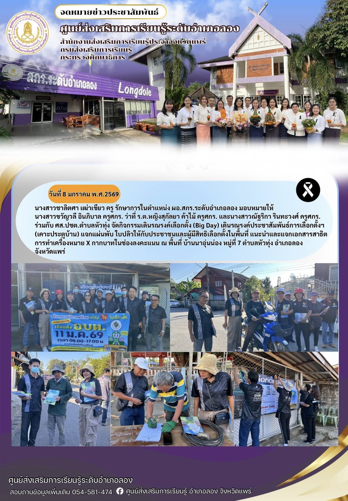 นางสาวชาลิตศา เฒ่าเขียว ครู รักษาการในตำแหน่ง ผอ.สกร.ระดับอำเภอลอง มอบหมายให้ นางสาวขวัญวลี อินภิบาล ว่าที่ ร.ต.หญิงสุกัลยา ค้าไม้ และนางสาวณัฐริกา รินทะวงศ์ ครูศูนย์การเรียนรู้ ร่วมกับ ศส.ปชต.ตำบลหัวทุ่ง จัดกิจกรรมเดินรณรงค์เลือกตั้ง (Big Day) เดินรณรงค์ประชาสัมพันธ์การเลือกตั้งฯ (เคาะประตูบ้าน) แจกแผ่นพับ ใบปลิวให้กับประชาชนและผู้มีสิทธิเลือกตั้งในพื้นที่ แนะนำและแจกเอกสารสาธิตการทำเครื่องหมาย X กากบาทในช่องลงคะแนน ณ พื้นที่ บ้านนาอุ่นน่อง หมู่ที่ 7 ตำบลหัวทุ่ง อำเภอลอง จังหวัดแพร่