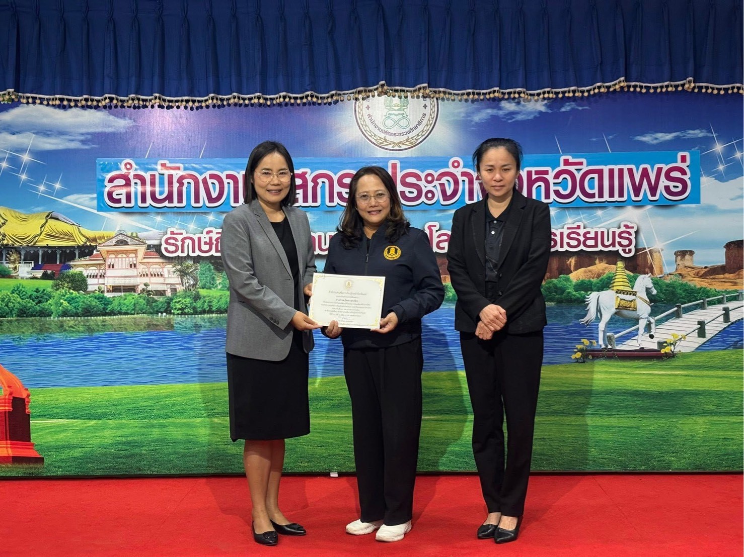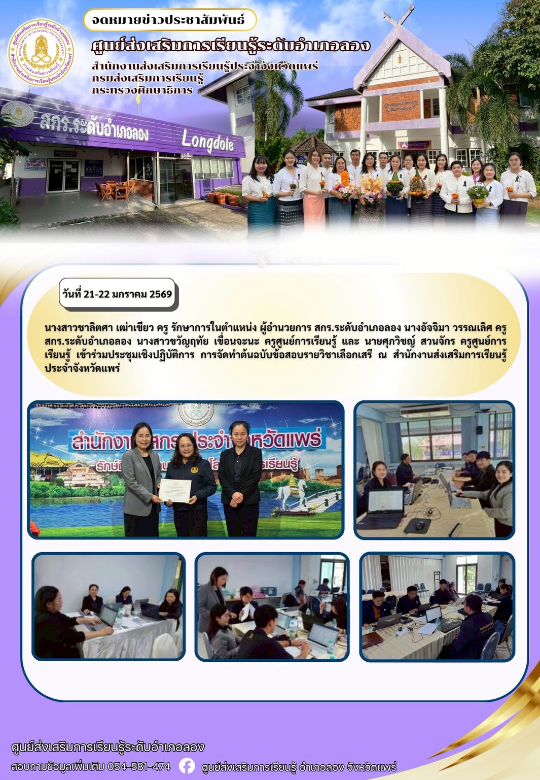 นางสาวชาลิตศา เฒ่าเขียว ครู รักษาการในตำแหน่ง ผู้อำนวยการ สกร.ระดับอำเภอลอง นางอัจจิมา วรรณเลิศ ครูสกร.ระดับอำเภอลอง นางสาวขวัญฤทัย เขื่อนจะนะ ครูศูนย์การเรียนรู้ และ นายศุภวิชญ์ สวนจักร ครูศูนย์การเรียนรู้ เข้าร่วมประชุมเชิงปฏิบัติการ การจัดทำต้นฉบับข้อสอบรายวิชาเลือกเสรี ณ สำนักงานส่งเสริมการเรียนรู้ประจำจังหวัดแพร่