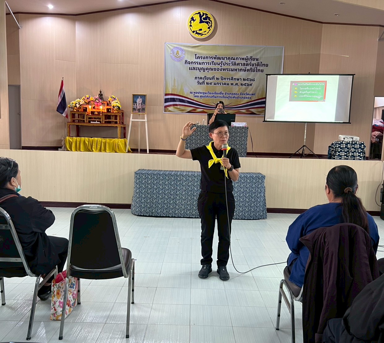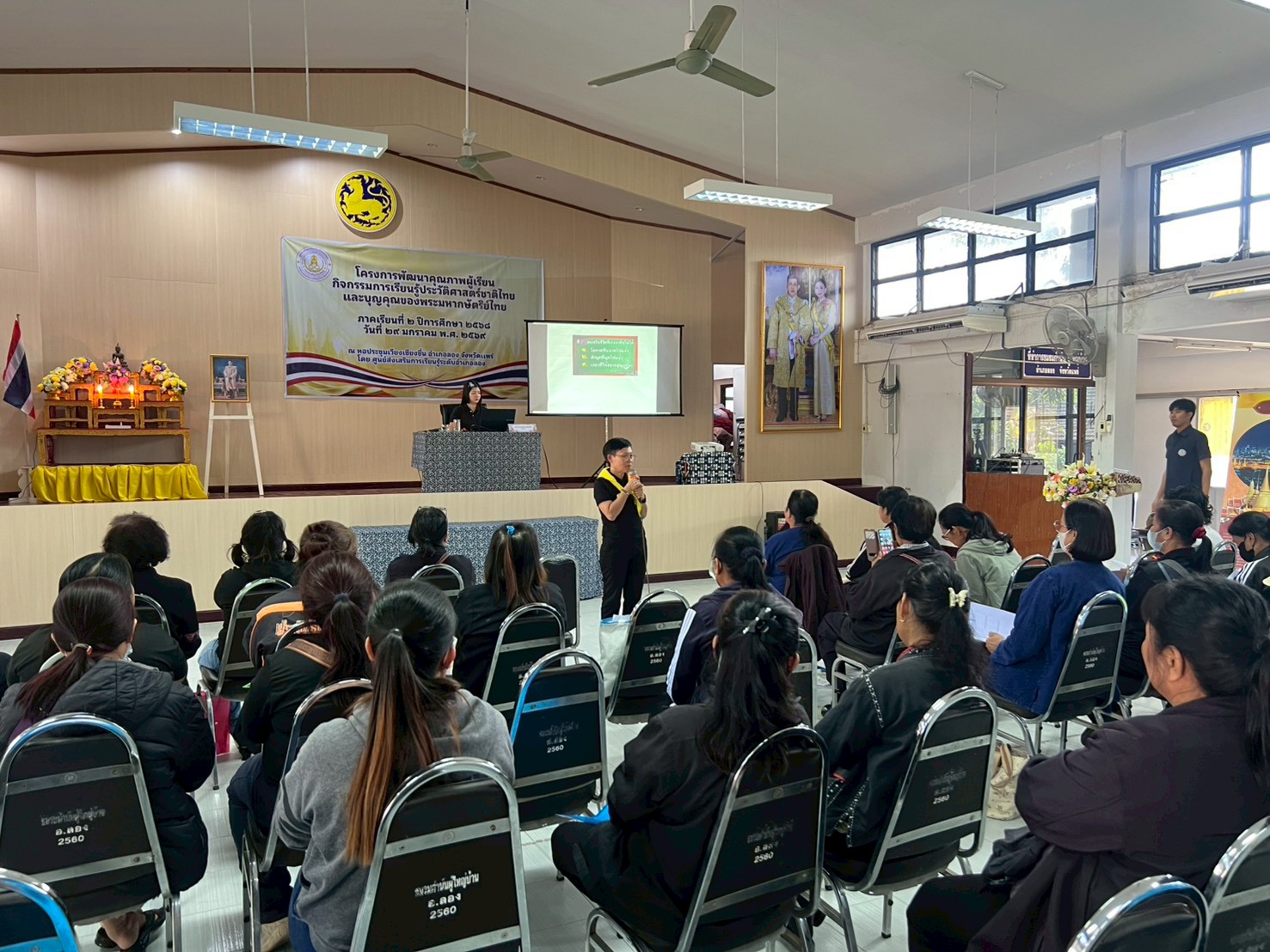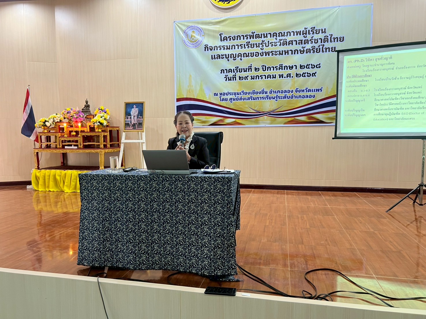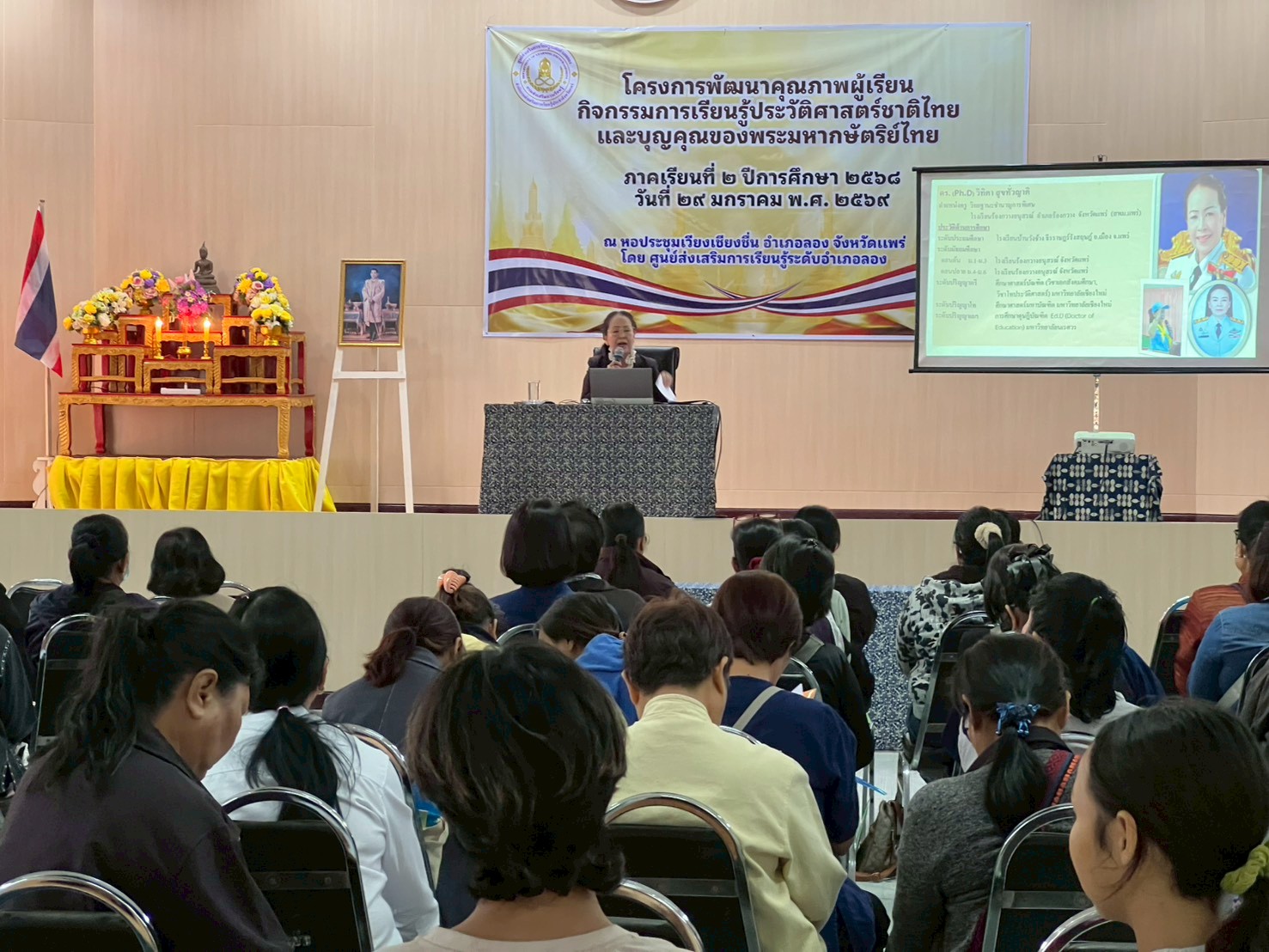 นางสาวชาลิตศา เฒ่าเขียว ครู รักษาการในตำแหน่ง ผอ.สกร.ระดับอำเภอลอง มอบหมายให้คณะครูและบุคลากรสกร.ระดับอำเภอลอง จัดการอบรมโครงการพัฒนาคุณภาพผู้เรียนกิจกรรมการเรียนรู้ประวัติศาสตร์ชาติไทยและบุญคุณของพระมหากษัตริย์ไทย โดยมีหัวข้อการบรรยาย ดังนี้ 1.ประวัติศาสตร์ชาติไทยและบุญคุณของพระมหากษัตริย์ไทย (โดย ดร.วิทิตา สุขทั่วญาติ) 2.พระราชประวัติของสมเด็จพระนางเจ้าสิริกิติ์ พระบรมราชินีนาถ พระบรมราชชนนี พันปีหลวง (โดย นางสาวเสาวนีย์ ชาพัฒิพงศ์) พิธีเปิด โดย นายสามารถ อินทปัญญา นายอำเภอลอง ณ หอประชุมเวียงเชียงชื่น ที่ว่าการอำเภอลอง