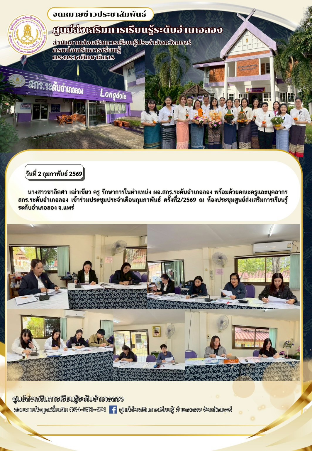นางสาวชาลิตศา เฒ่าเขียว ครู รักษาการในตำแหน่ง ผอ.สกร.ระดับอำเภอลอง พร้อมด้วยคณะครูและบุคลากร สกร.ระดับอำเภอลอง เข้าร่วมประชุมประจำเดือนกุมภาพันธ์ ครั้งที่2/2569 ณ ห้องประชุมศูนย์ส่งเสริมการเรียนรู้ระดับอำเภอลอง จ.แพร่