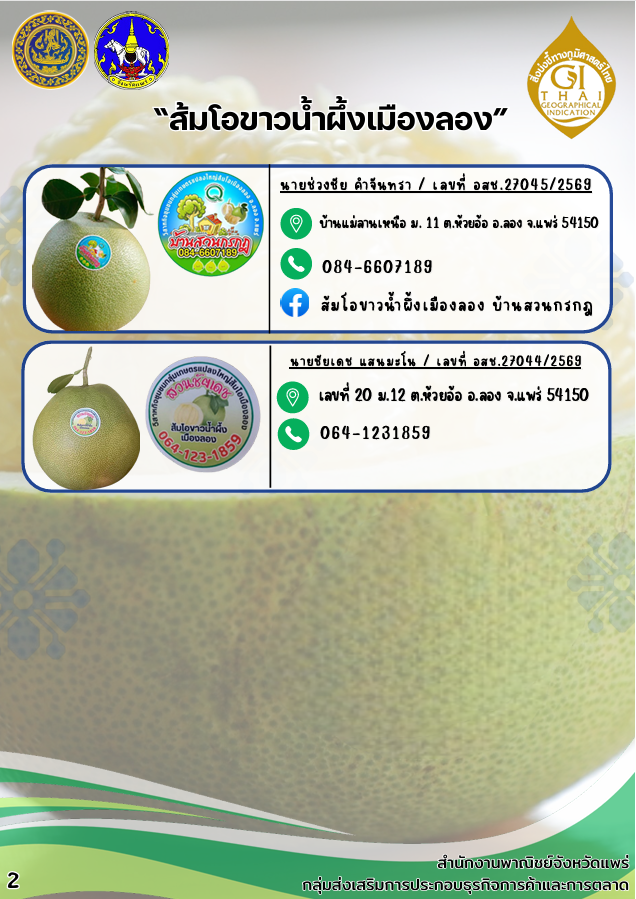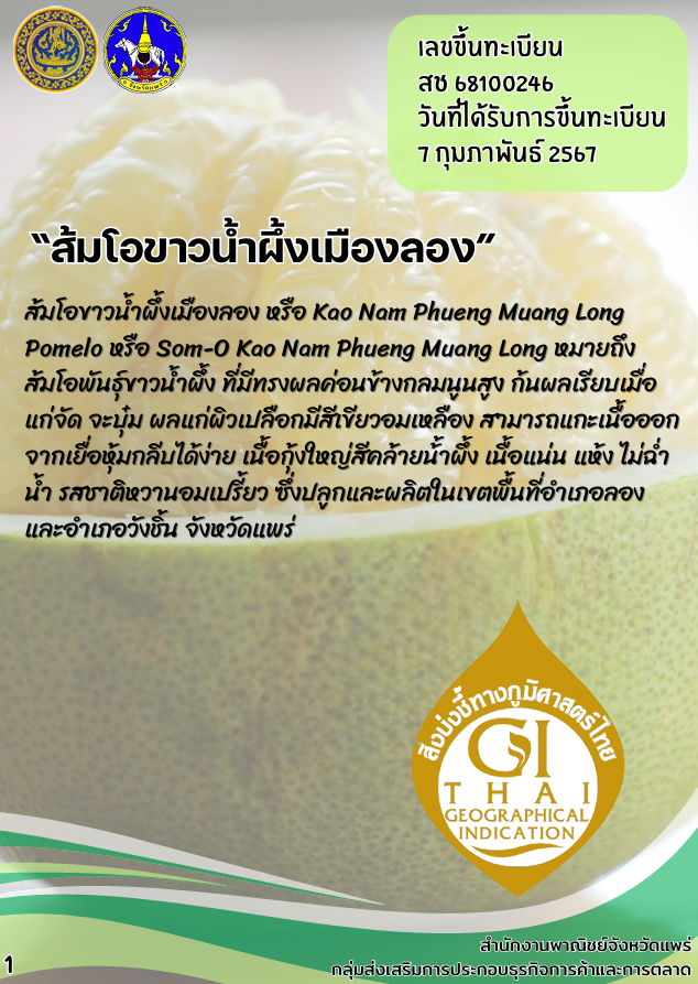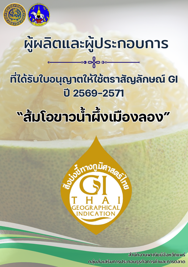 ประชาสัมพันธ์รายชื่อผู้ผลิตและผู้ประกอบการที่ได้รับหนังสืออนุญาตให้ใช้ตราสัญลักษณ์สิ่งบ่งชี้ทางภูมิศาสตร์ไทย (GI) “สินค้าส้มโอขาวน้ำผึ้งเมืองลอง”