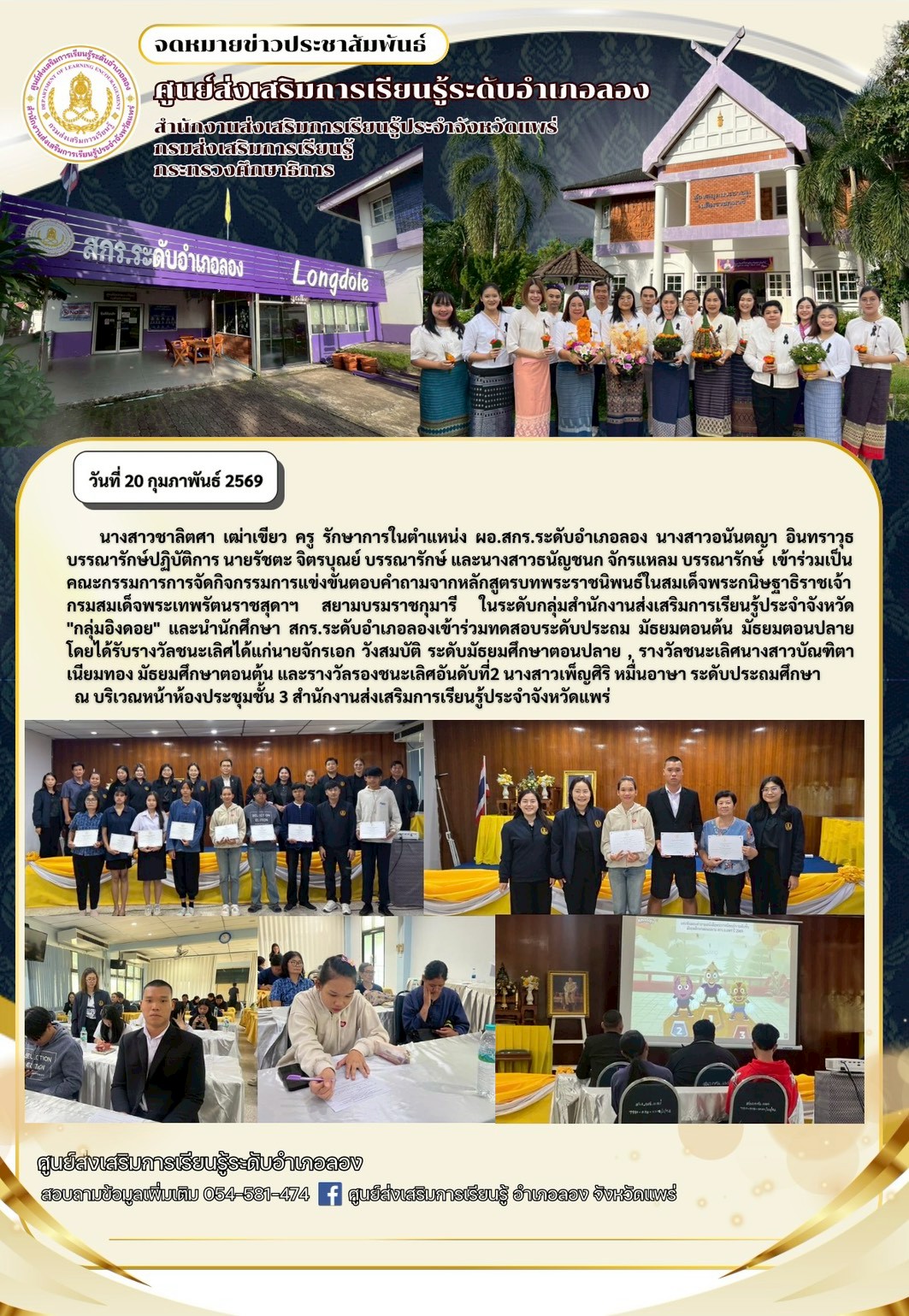นางสาวชาลิตศา เฒ่าเขียว ครู รักษาการในตำแหน่ง ผอ.สกร.ระดับอำเภอลอง นางสาวอนันตญา อินทราวุธ บรรณารักษ์ปฏิบัติการ นายรัชตะ จิตรบุณย์ บรรณารักษ์ นางสาวธนัญชนก จักรแหลมเข้าร่วมเป็นคณะกรรมการ บรรณารักษ์ เข้าร่วมเป็นคณะกรรมการการจัดกิจกรรมการแข่งขันตอบคำถามจากหลักสูตรบทพระราชนิพนธ์ในสมเด็จพระกนิษฐาธิราชเจ้า กรมสมเด็จพระเทพรัตนราชสุดาฯ สยามบรมราชกุมารี ในระดับกลุ่มสำนักงานส่งเสริมการเรียนรู้ประจำจังหวัด “กลุ่มอิงดอย” และนำนักศึกษา สกร.ระดับอำเภอลองเข้าร่วมทดสอบระดับประถม มัธยมตอนต้น มัธยมตอนปลาย โดยได้รับรางวัลชนะเลิศได้แก่นายจักรเอก วังสมบัติ ระดับมัธยมศึกษาตอนปลาย , รางวัลชนะเลิศนางสาวบัณฑิตา เนียมทอง มัธยมศึกษาตอนต้น และรางวัลรองชนะเลิศอันดับที่2 นางสาวเพ็ญศิริ หมื่นอาษา ระดับประถมศึกษา ณ ห้องประชุมชั้น 3 สำนักงานส่งเสริมการเรียนรู้ประจำจังหวัดแพร่