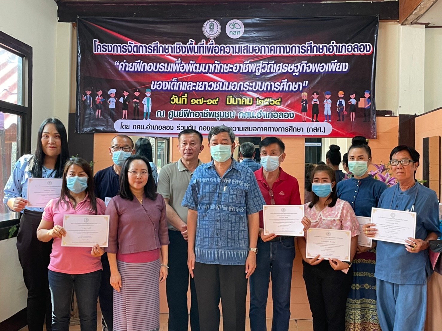 วันที่ 19มีนาคม 2564 / กศน.อำเภอลอง ร่วมกับ กองทุนเพื่อความเสมอภาคทางการศึกษา (กสศ.) ได้รับเกียรติจากนายจรินทร์ เก่งสงวนสิทธิ์ นายอำเภอลอง เป็นประธานในพิธีมอบเกียรติบัตรแก่เด็กและเยาวชนนอกระบบการศึกษา รวมถึงวิทยากร ที่มาเข้าร่วมค่ายอบรมการเรียนรู้สู่วิถีพอเพียง สำหรับกลุ่มเป้าหมายเด็กและเยาวชนนอกระบบการศึกษา ตามโครงการจัดการศึกษาเชิงพื้นที่เพื่อความเสมอภาคทางการศึกษาอำเภอลอง ตั้งแต่วันที่ 17-19 มีนาคม 2564 ณ ศูนย์ฝึกอาชีพชุมชน กศน.อำเภอลอง