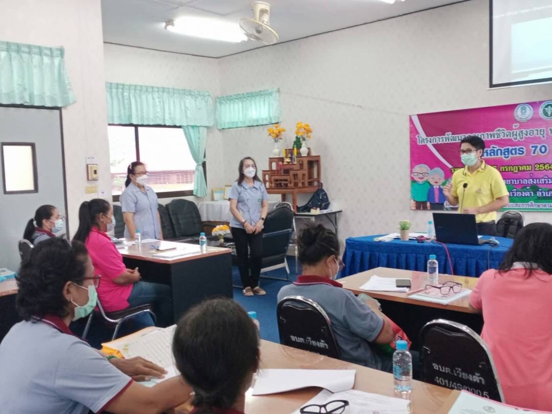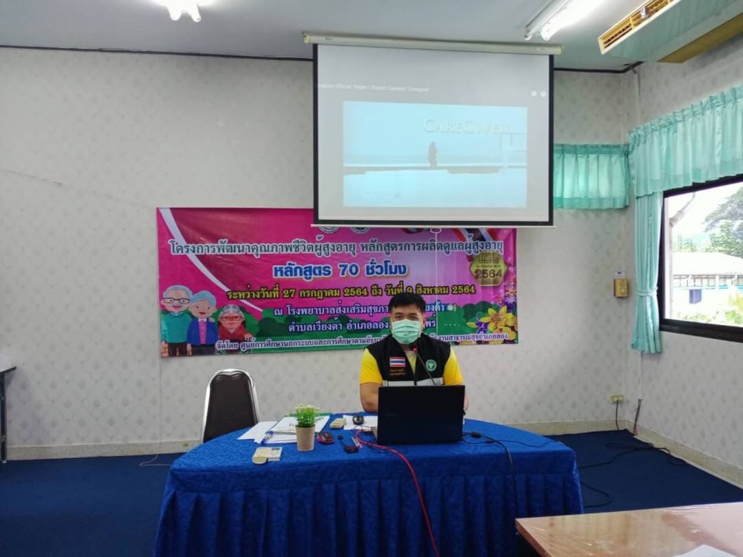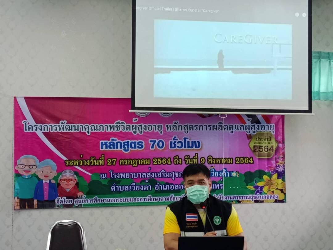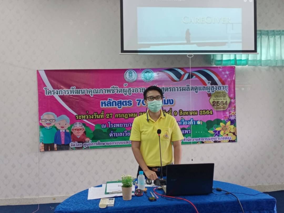 วันที่ 28 กรกฎาคม 2564 โดยนางสาวรติรัตน์ อินต์ธะวิชัย ผอ.กศน.อำเภอลอง มอบหมายให้นายชาญวิทย์ อนุศาสน์ปรีชากุล ครูกศน.ตำบลเวียงต้า จัดโครงการพัฒนาคุณภาพชีวิตผู้สูงอายุ หลักสูตรการผลิตผู้ดูแลผู้สูงอายุ 70 ชั่วโมง ระหว่างวันที่ 27 กรกฎาคม 2564 ถึง วันที่ 9 สิงหาคม 2564 เป้าหมาย 20 คน ณ โรงพยาบาลส่งเสริมสุขภาพตำบลเวียงต้า หมู่ 5 ต.เวียงต้า อ.ลอง จ.แพร่ โดยได้รับเกียรติจากผู้อำนวยการสาธารณสุขอำเภอลอง มาเป็นประธานในพิธีเปิด และให้กำลังใจแก่ผู้เข้ารับการอบรม และมีนางทัศน์วันท์ แสนเตชะ ผู้อำนวยการโรงพยาบาลส่งเสริมสุขภาพตำบลเวียงต้า เป็นวิทยากรให้ความรู้ และได้รับการนิเทศจากนางสาวรัชนีกร พิมสาร ครู กศน.อำเภอลอง