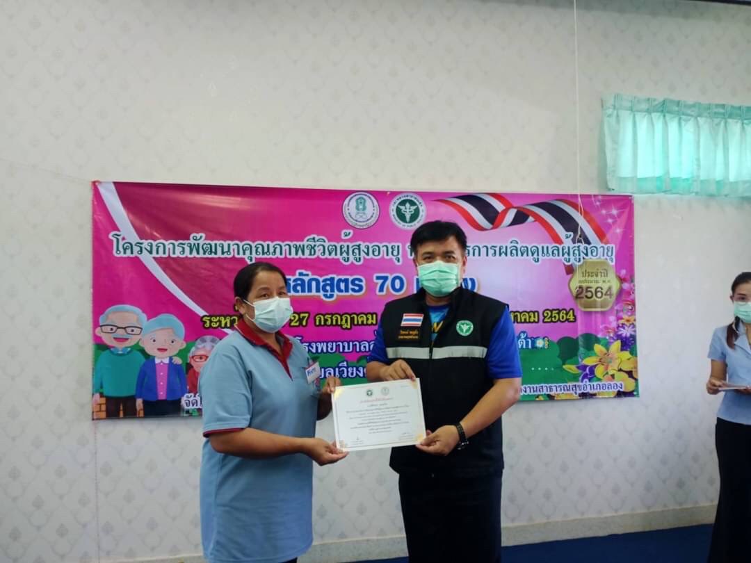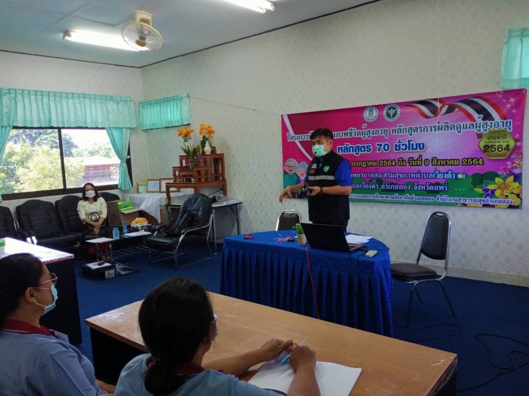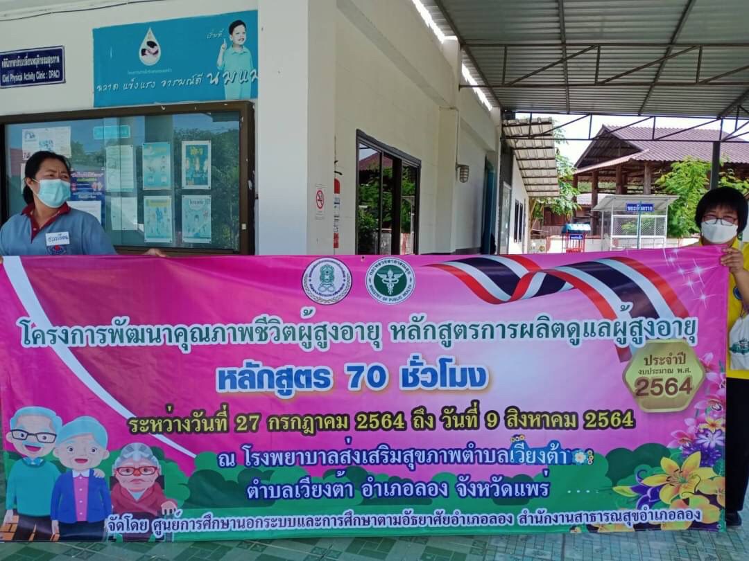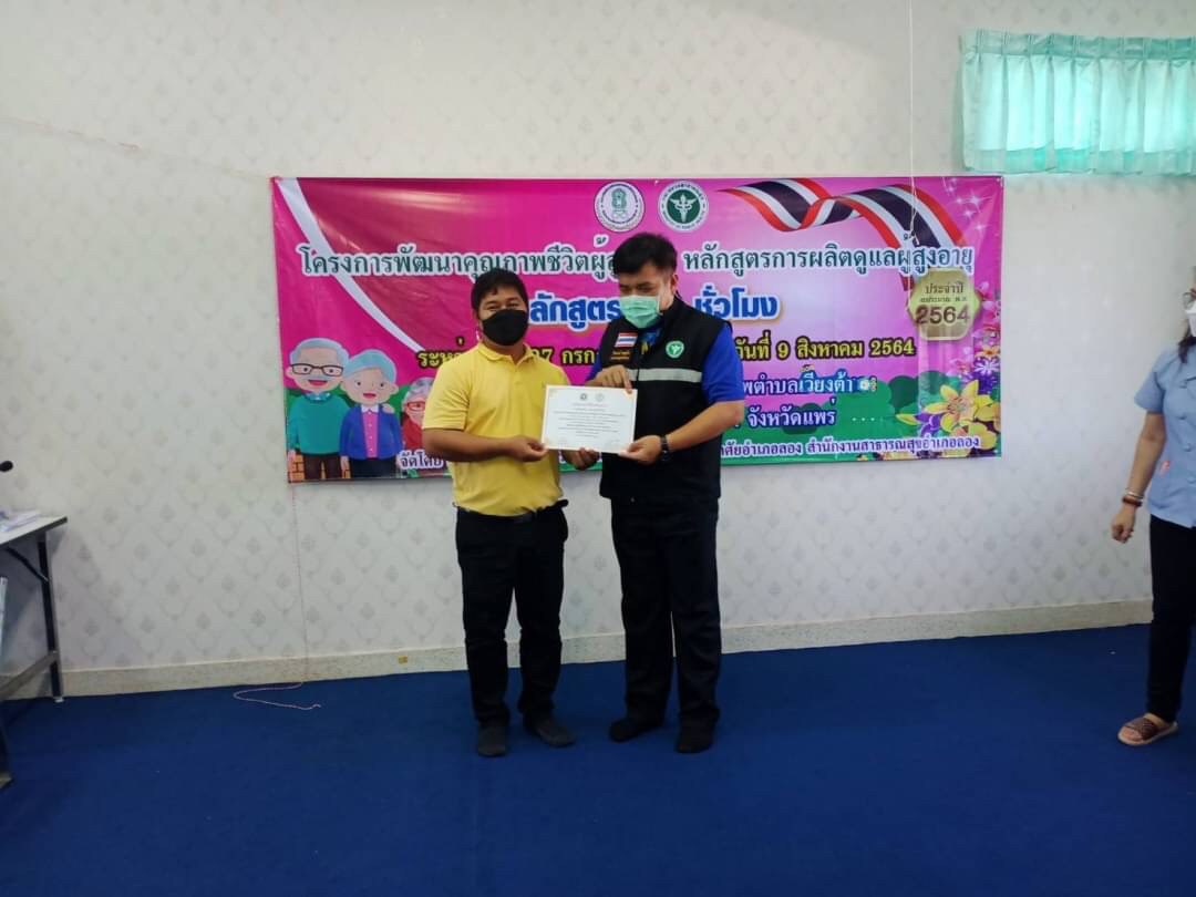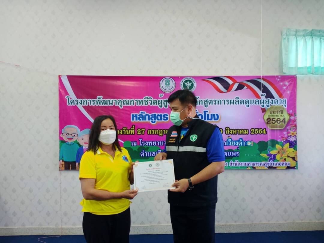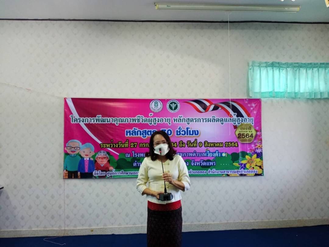 วันที่ 9 สิงหาคม โดยนางสาวรติรัตน์ อินต์ธะวิชัย ผอ.กศน.อำเภอลอง มอบหมายให้นายชาญวิทย์ อนุศาสน์ปรีชากุล ครูกศน.ตำบลเวียงต้า จัดโครงการพัฒนาคุณภาพชีวิตผู้สูงอายุ หลักสูตรการผลิตผู้ดูแลผู้สูงอายุ 70 ชั่วโมง ระหว่างวันที่ 27 กรกฎาคม 2564 ถึง วันที่ 9 สิงหาคม 2564 เป้าหมาย 20 คน ณ โรงพยาบาลส่งเสริมสุขภาพตำบลเวียงต้า หมู่ 5 ต.เวียงต้า อ.ลอง จ.แพร่ โดยได้รับเกียรติจากสาธารณสุขอำเภอลอง มาร่วมเป็นเกียรติในพิธีปิดและมอบเกียรติบัตรให้กับผู้จบหลักสูตรการผลิตผู้ดูแลผู้สูงอายุ โดยมีนางสาวรติรัตน์ อินต์ธะวิชัย ผู้อำนวยการศูนย์การศึกษานอกระบบและการศึกษาตามอัธยาศัยอำเภอลอง นิเทศก์กิจกรรมและร่วมมอบเกียรติบัตรให้กับคณะวิทยากร และเป็นประธานปิดการอบรม