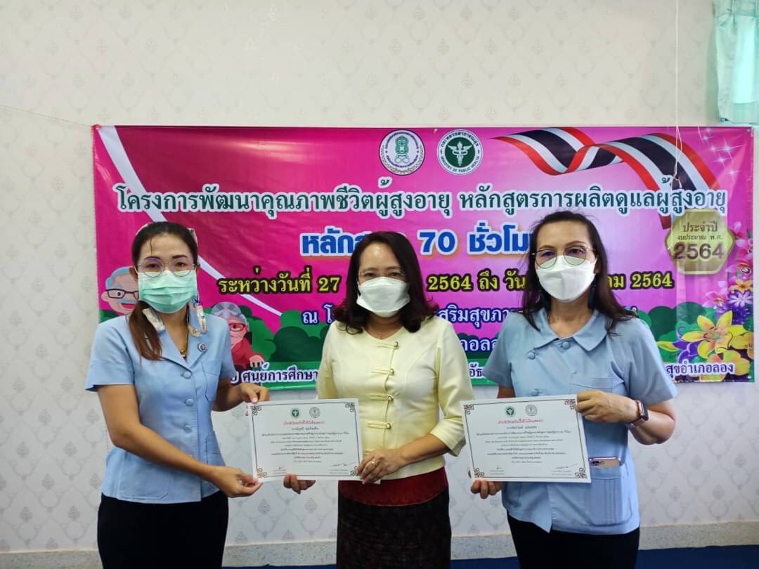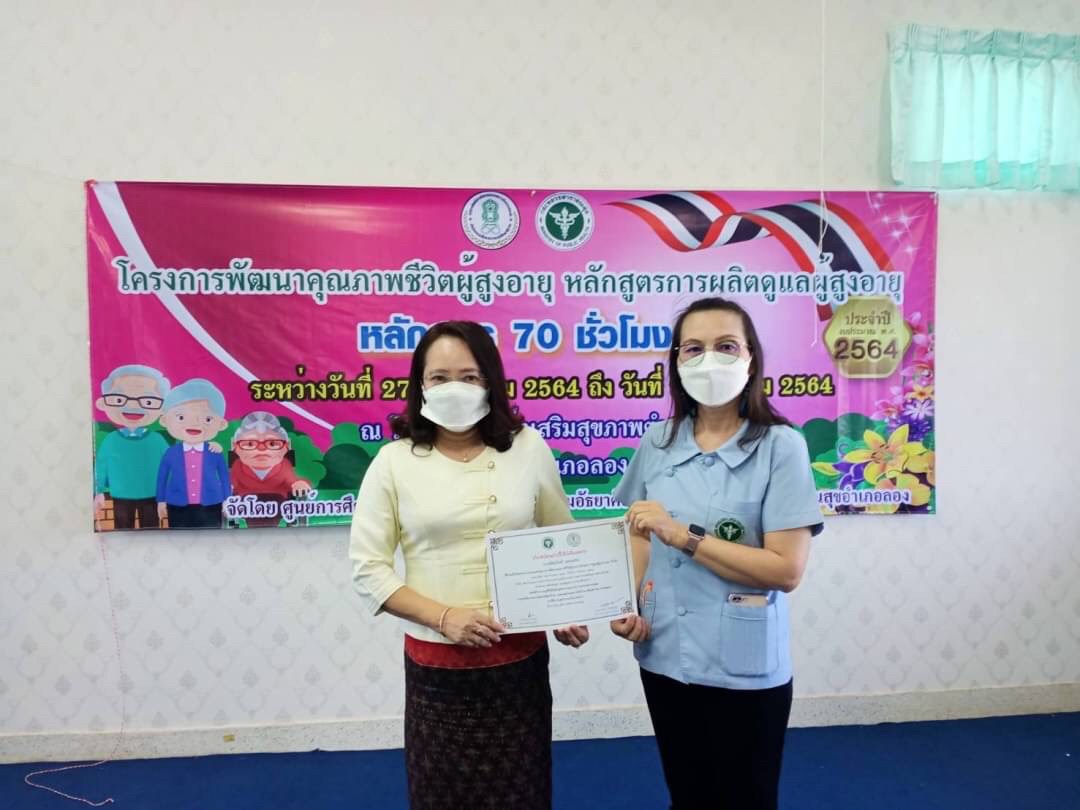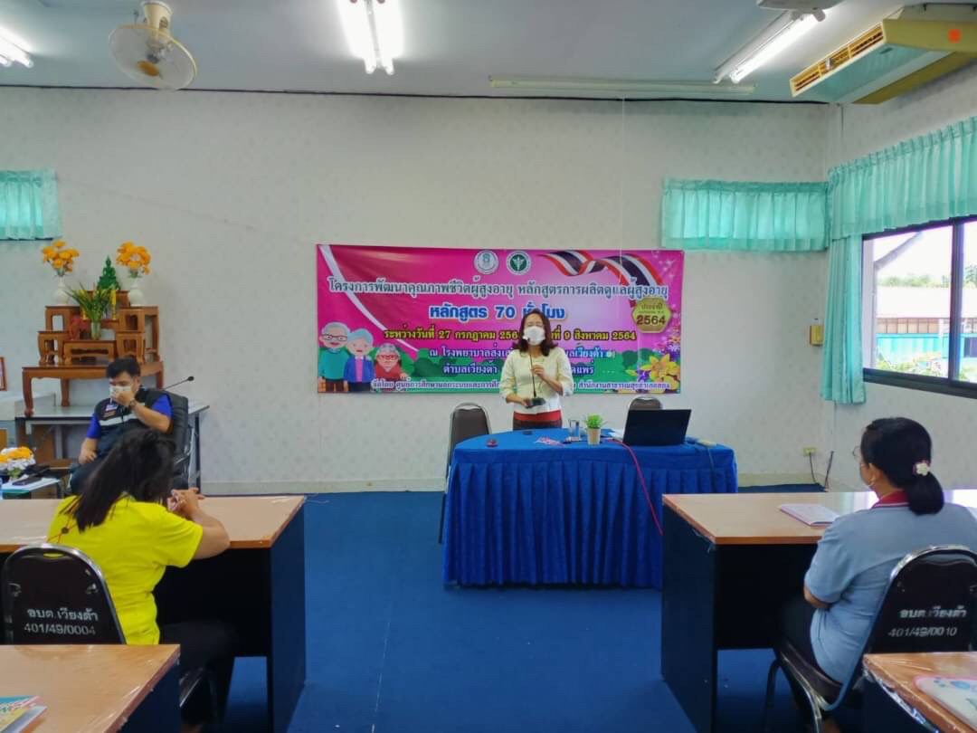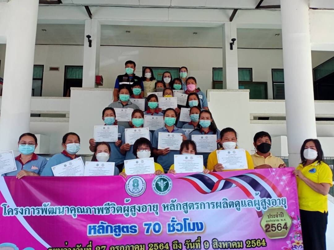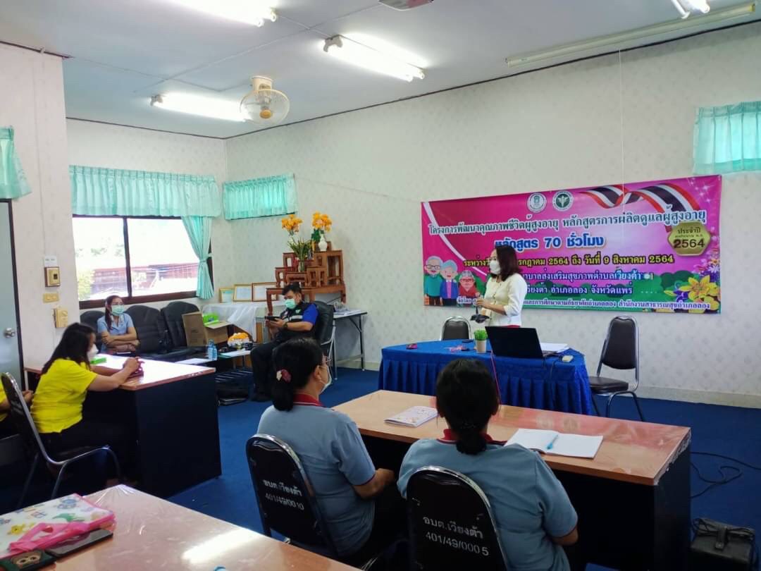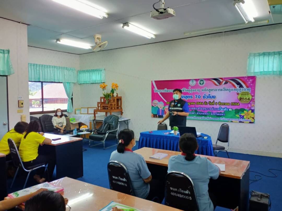 วันที่ 9 สิงหาคม โดยนางสาวรติรัตน์ อินต์ธะวิชัย ผอ.กศน.อำเภอลอง มอบหมายให้นายชาญวิทย์ อนุศาสน์ปรีชากุล ครูกศน.ตำบลเวียงต้า จัดโครงการพัฒนาคุณภาพชีวิตผู้สูงอายุ หลักสูตรการผลิตผู้ดูแลผู้สูงอายุ 70 ชั่วโมง ระหว่างวันที่ 27 กรกฎาคม 2564 ถึง วันที่ 9 สิงหาคม 2564 เป้าหมาย 20 คน ณ โรงพยาบาลส่งเสริมสุขภาพตำบลเวียงต้า หมู่ 5 ต.เวียงต้า อ.ลอง จ.แพร่ โดยได้รับเกียรติจากสาธารณสุขอำเภอลอง มาร่วมเป็นเกียรติในพิธีปิดและมอบเกียรติบัตรให้กับผู้จบหลักสูตรการผลิตผู้ดูแลผู้สูงอายุ โดยมีนางสาวรติรัตน์ อินต์ธะวิชัย ผู้อำนวยการศูนย์การศึกษานอกระบบและการศึกษาตามอัธยาศัยอำเภอลอง นิเทศก์กิจกรรมและร่วมมอบเกียรติบัตรให้กับคณะวิทยากร และเป็นประธานปิดการอบรม