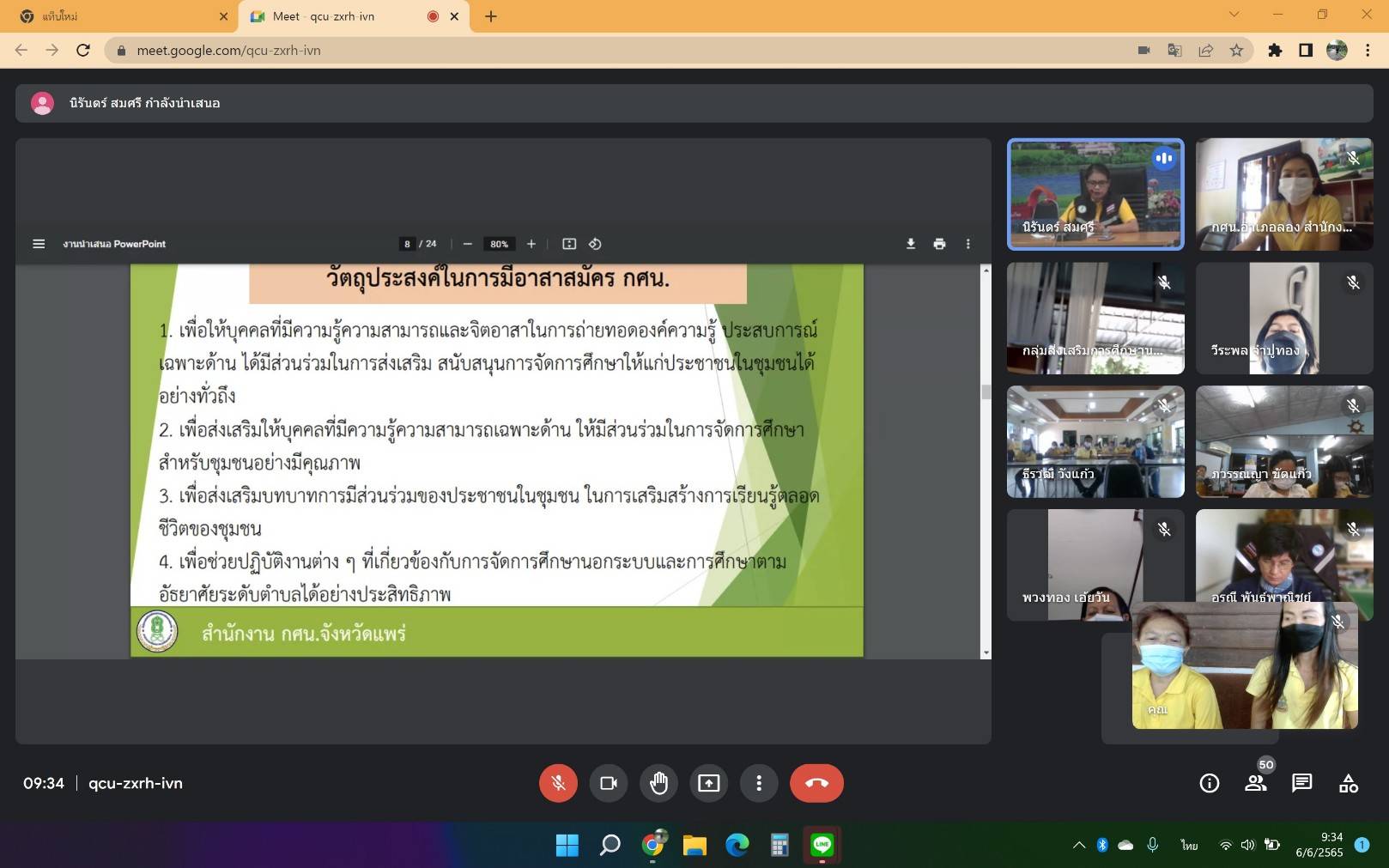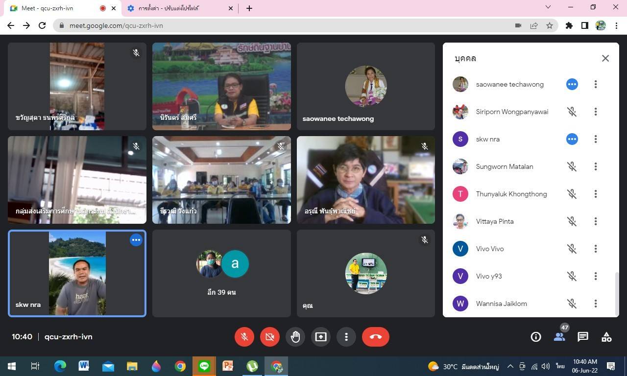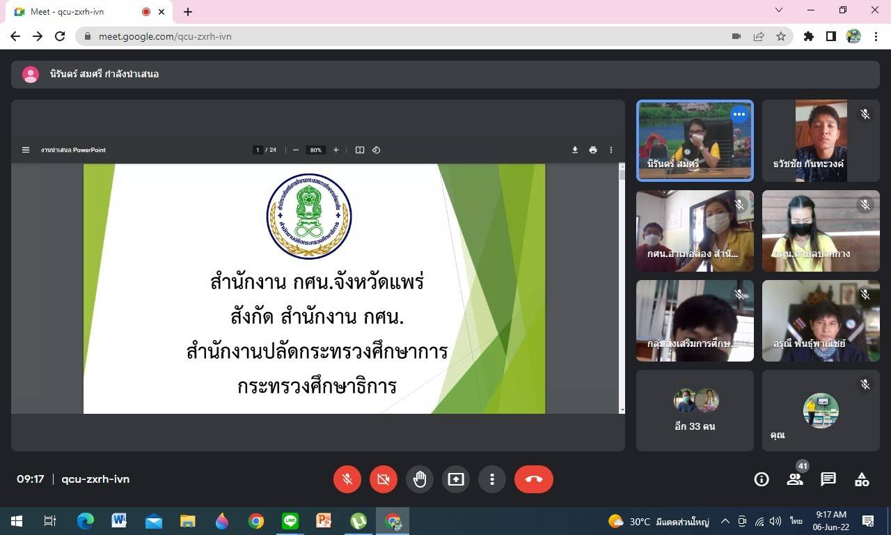 วันที่ 6 มิถุนายน 2565 นางสาวรติรัตน์ อินต์ธะวิชัย ผู้อำนวยการกศน.อำเภอลอง มอบหมายให้ ครูกศน.ตำบลและอาสาสมัครกศน.อำเภอลอง จำนวน 27 คน เข้าร่วมการอบรมชี้แจงแนวทางการดำเนินงานอาสาสมัครกศน. ผ่านระบบออนไลน์ Google Meet สำนักงานกศน.จังหวัดแพร่