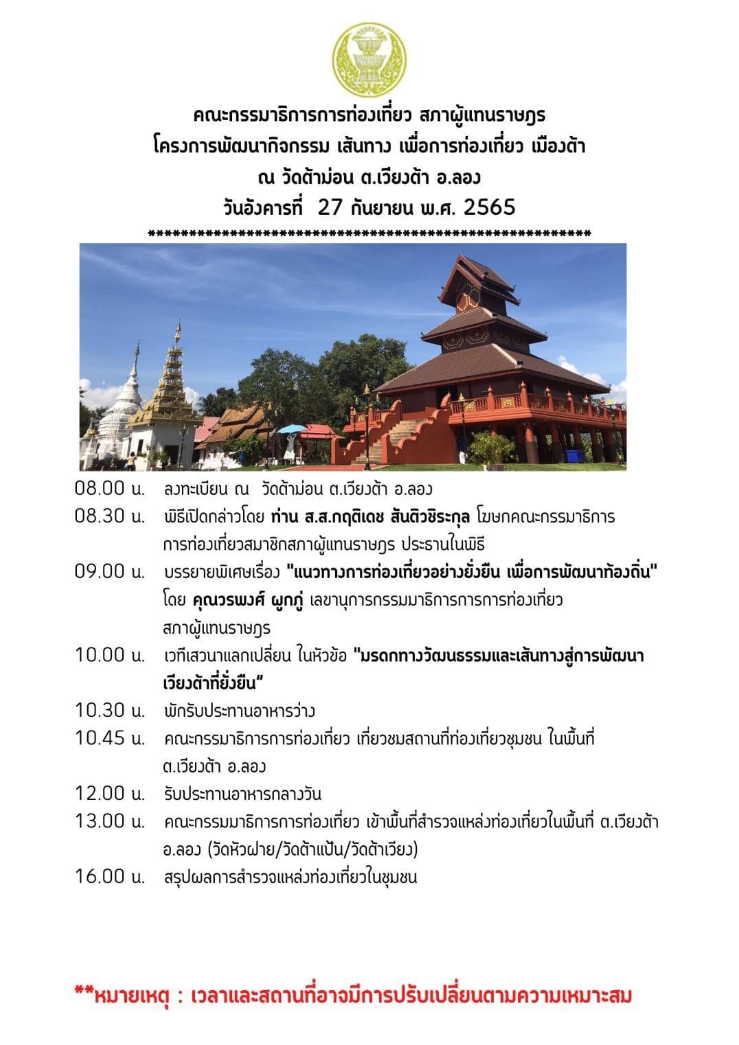 27 กันยายน 2565 นางสาวรติรัตน์ อินต์ธะวิชัย ผู้อำนวยการ กศน.อำเภอลอง มอบหมายให้นายชาญวิทย์ อนุศาสน์ปรีชากุล เข้าร่วมเวทีสัมมนา โครงการพัฒนากิจกรรม เส้นทาง เพื่อการท่องเที่ยว เมืองต้า ณ วัดต้าม่อน ตำบลเวียงต้า อำเภอลอง จังหวัดแพร่ จัดโดยคณะกรรมาธิการการท่องเที่ยว สภาผู้แทนราษฎร