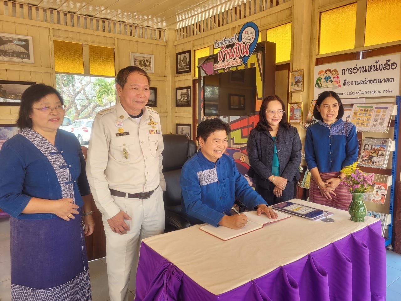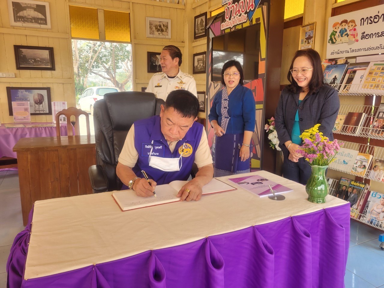 นางสาวรติรัตน์ อินต์ธะวิชัย ผอ.กศน.อำเภอลอง,นางอัจจิมา วรรณเลิศ ครู,นายภาสกร ถาเงิน ครูกศน.ตำบลบ้านปิน,นายรัชตะ จิตรบุณย์ และนางสาวธนัญชนก จักรแหลม บรรณารักษ์ห้องสมุดประชาชน “เฉลิมราชกุมารี” อำเภอลอง ต้อนรับคณะเยี่ยมชมการรถไฟแห่งประเทศไทย นายนิรุฒ มณีพันธ์ ผู้ว่าการรถแห่งประเทศไทยพร้อมคณะ พัฒนาการจังหวัด นายอำเภอลอง นายกเทศบาลตำบลบ้านปินและหัวหน้าส่วนราชการเข้าตรวจเยี่ยมบ้านหนังสือชุมชน สถานีรถไฟบ้านปิน อำเภอลอง จังหวัดแพร่