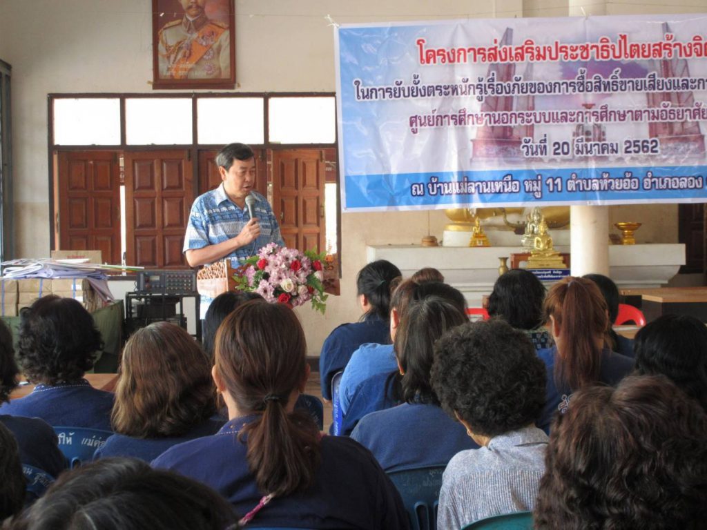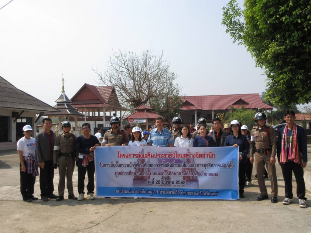 นางสาวรติรัตน์ อินต์ธะวิชัยผู้อำนวยการ กศน.อำเภอลอง คณะครูและบุคลากร กศน.อำเภอลอง ร่วมกับ กกต.จังหวัดแพร่ จัดโครงการส่งเสริมประชาธิปไตยสร้างจิตสำนึก ในการยับยั้งตระหนักรู้เรื่องภัยของการซื้อสิทธิ์ขายเสียงและการธุจริตการเลือกตั้ง โดยมีนายจรินทร์ เก่งสงวนสิทธิ์ นายอำเภอลอง เป็นประธาน พร้อมด้วยหน่วยงาน ส่วนราชการเข้าร่วมในการจัดกิจกรรม สถานีตำรวจภูธรลอง เทศบาลตำบลบ้านปิน ประมงอำเภอลอง วิทยาลัยการอาชีพลองและประชาชนบ้านแม่ลานเหนือ ณ บ้านแม่ลานเหนือ หมู่ที่ 11 ตำบลห้วยอ้อ อำเภอลอง จังหวัดแพร่